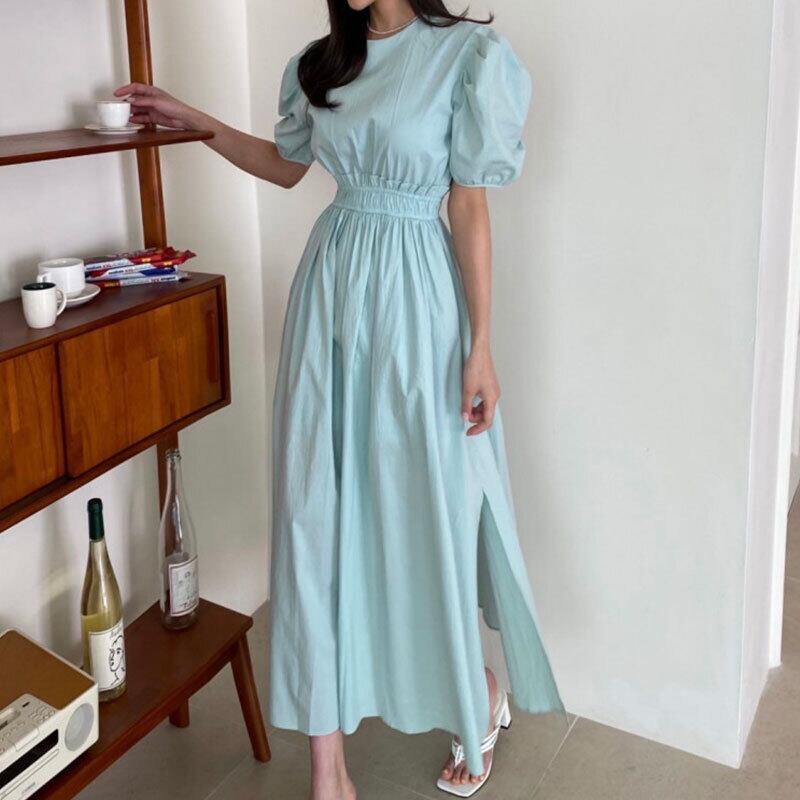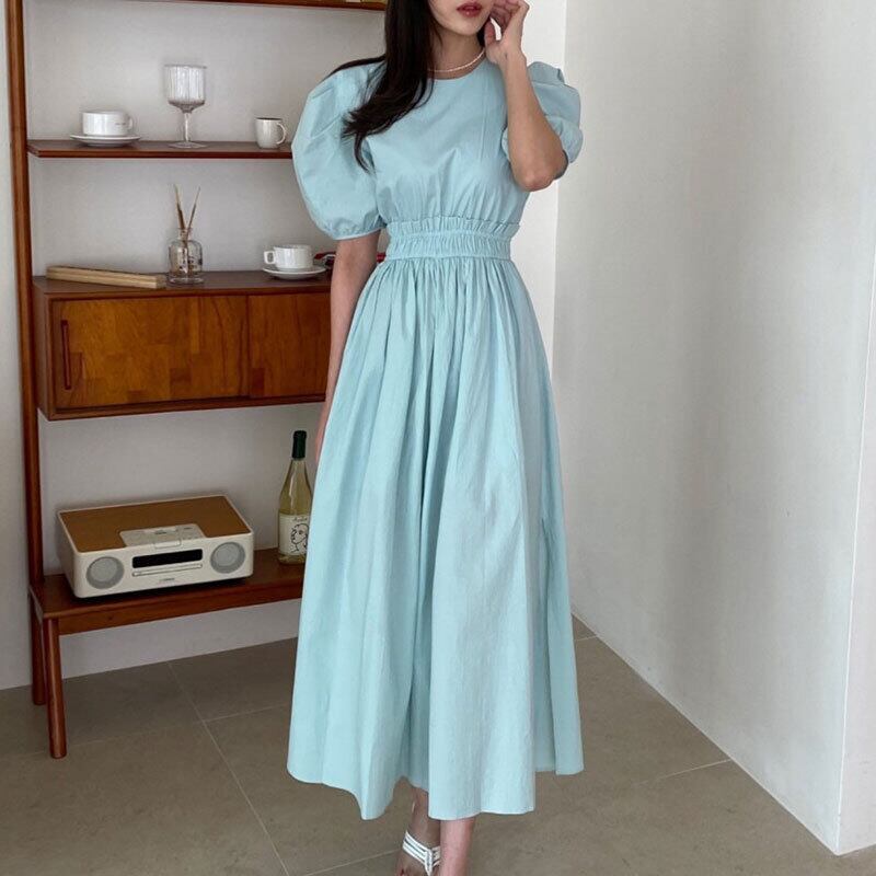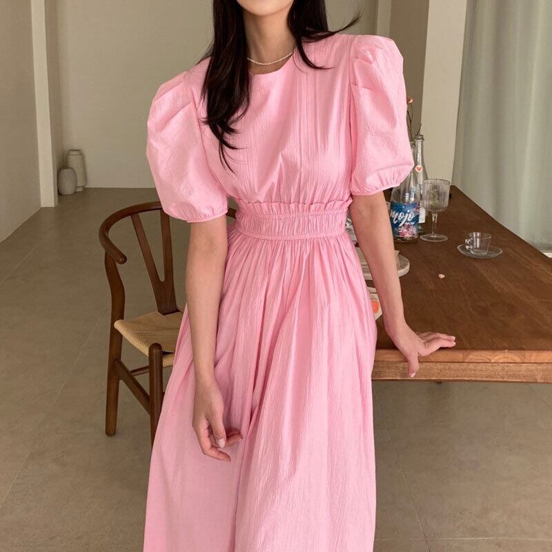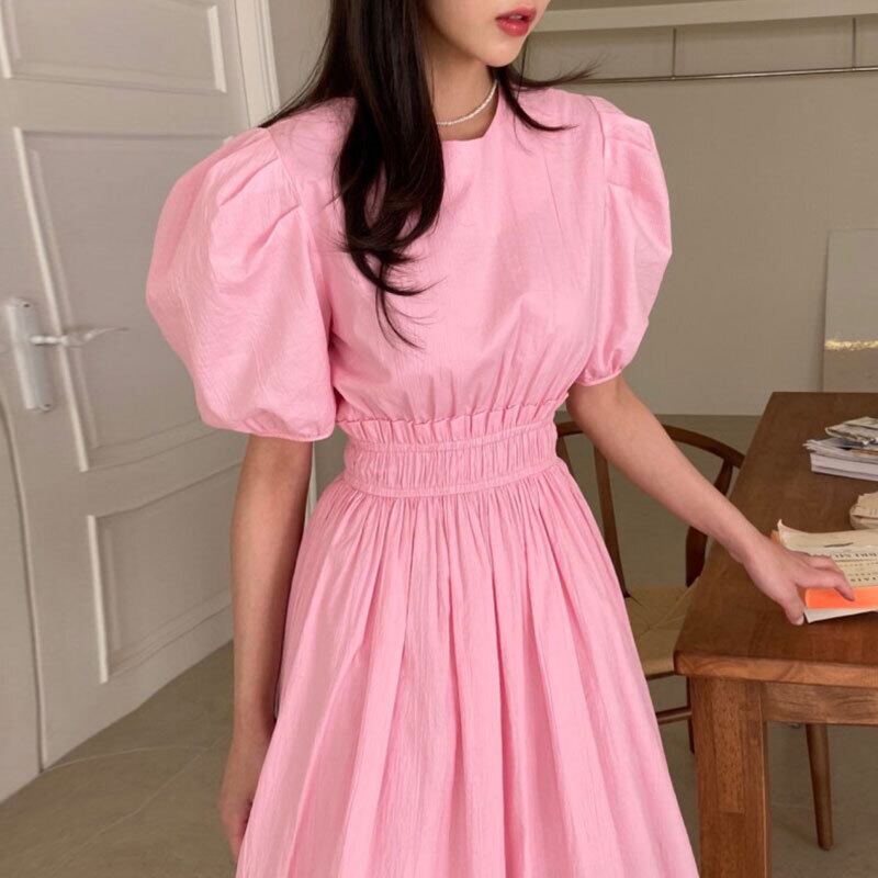 サマーラウンドネックプリーツウェストスリーブスリットドレス ピンク 大人ガーリー スウィート キュート カジュアル 夏物 Oネック ステッチ 5/3 春夏 SS Neploe mi4619047493952