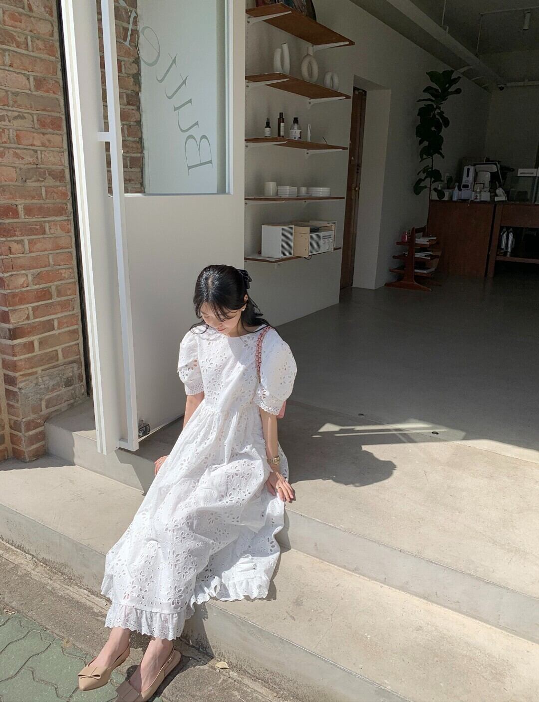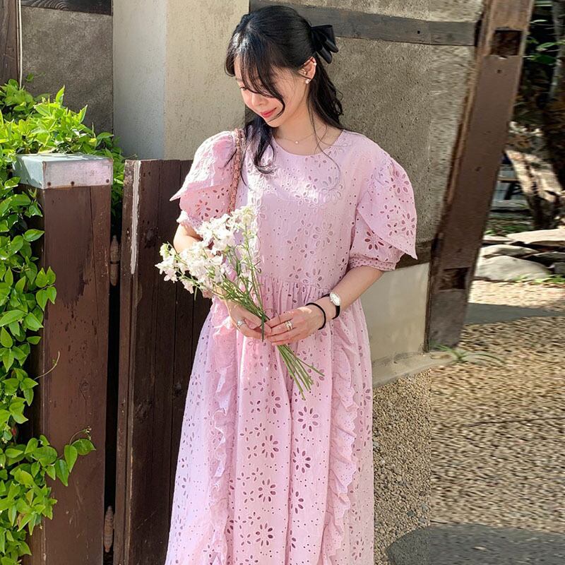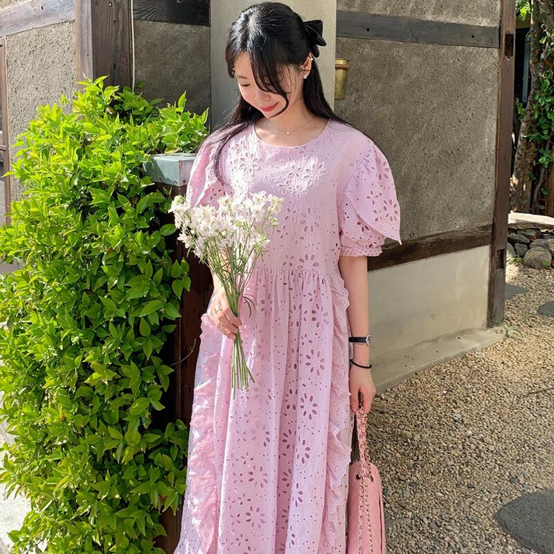 サマーラウンドネックウェストレースジャカードスリーブドレス 大人ガーリー スウィート キュート カジュアル 夏物 Oネック 5/3 春夏 SS Neploe mi4649366569246