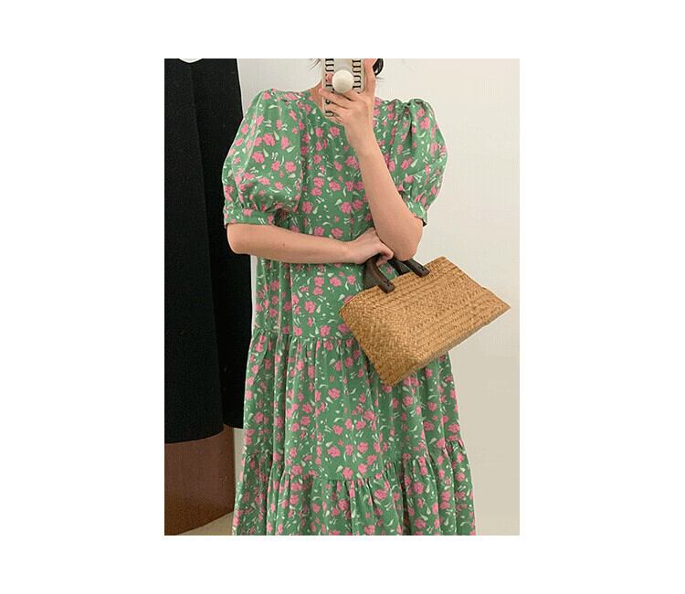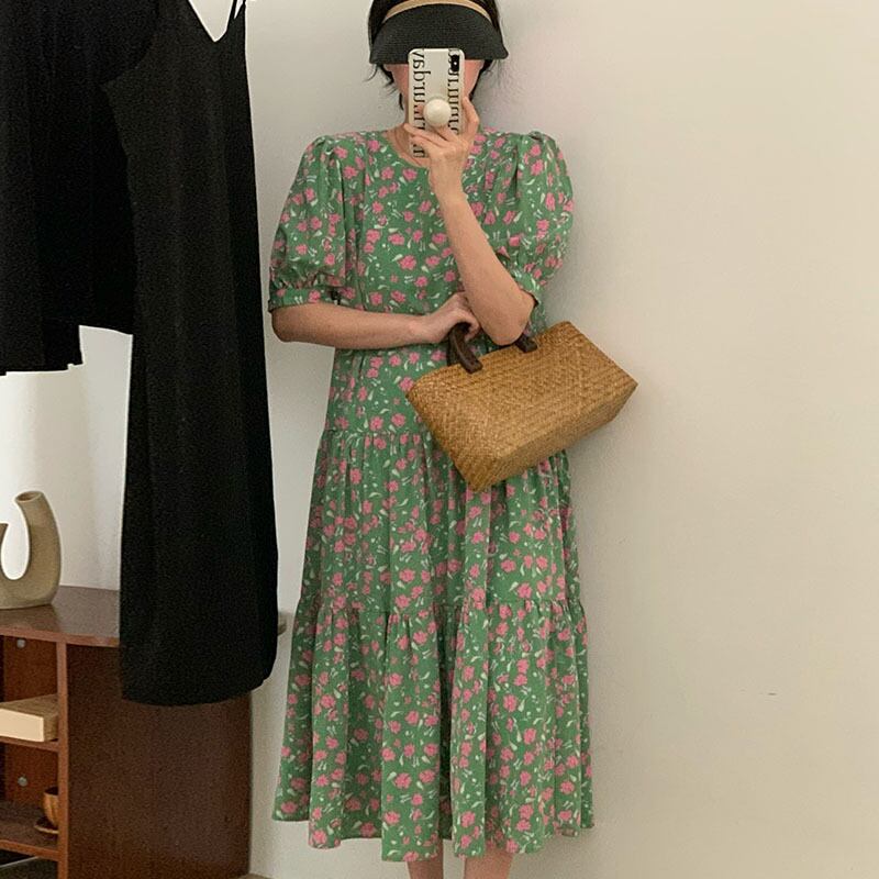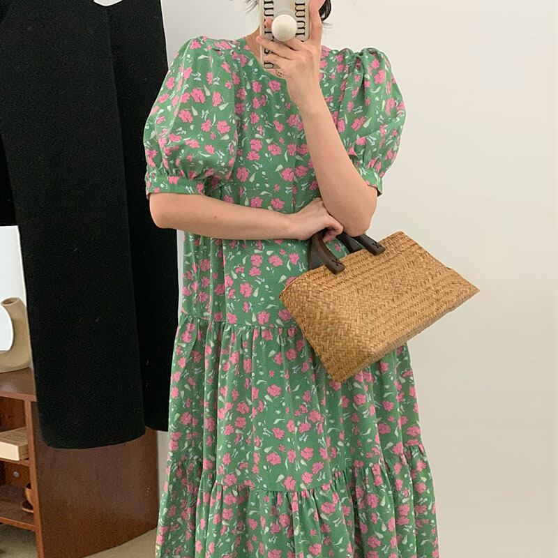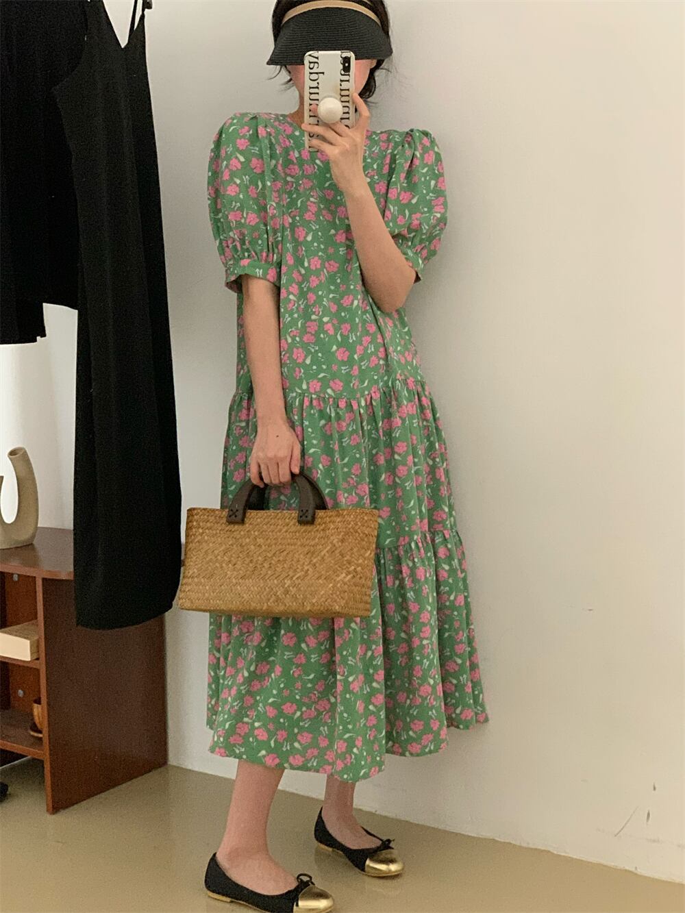 サマーラウンドネックプリーツルーズロングスリーブフローラルドレス レッド エレガント 夏物 花柄 Oネック 5/3 春夏 SS Neploe mi4621031630880