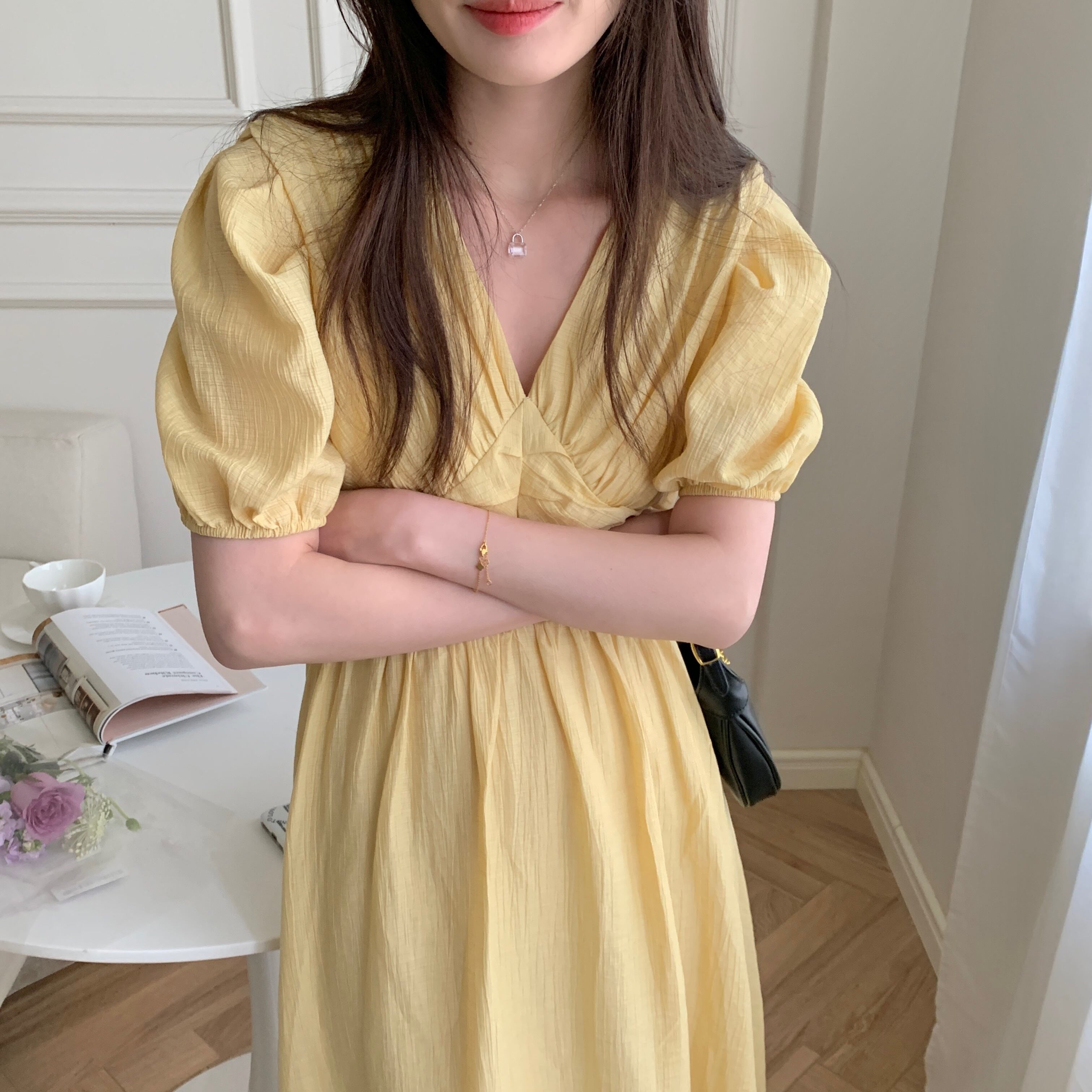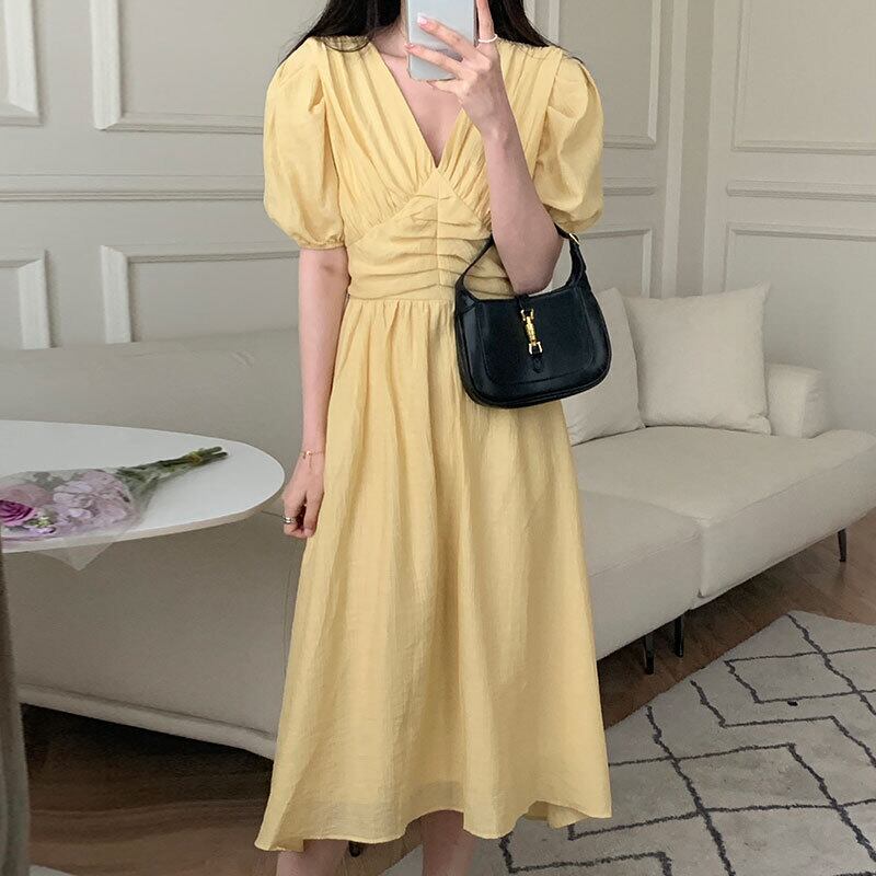 サマーVネックプリーツウェスト薄手ソリッド カラーロングドレス レディース エレガント 夏物 ソリッドカラー 5/3 春夏 SS Neploe mi4681588670098