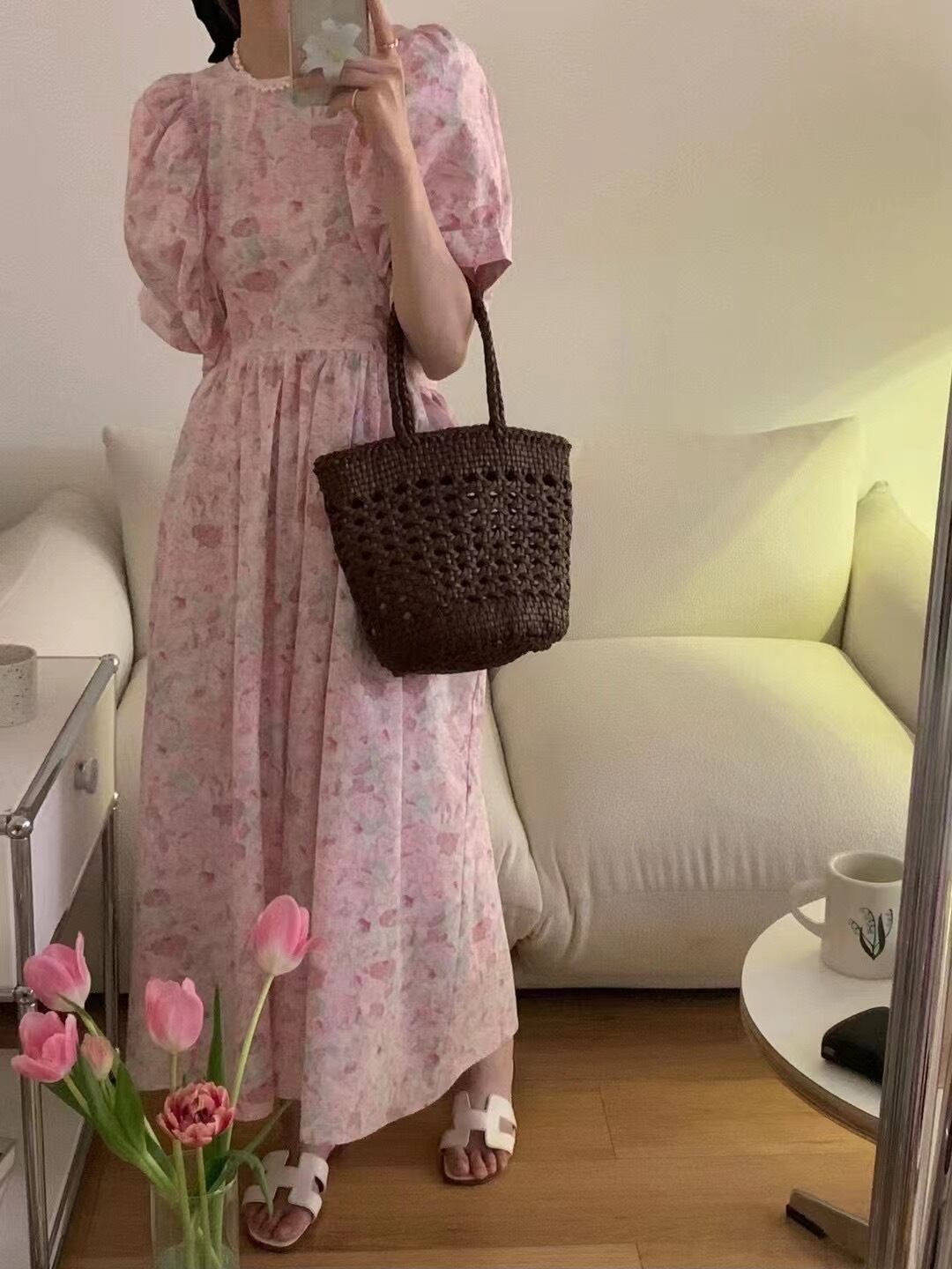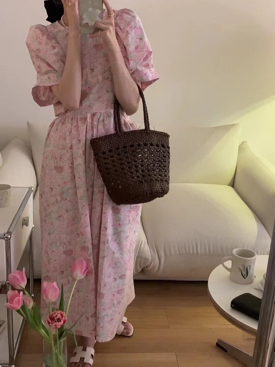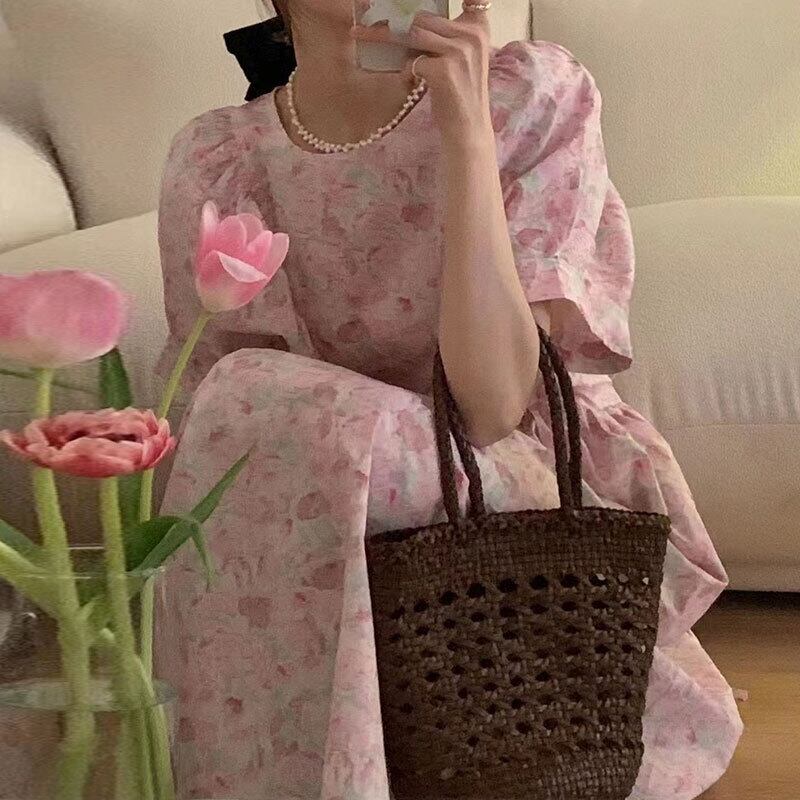 サマーラウンドネックカラープリントプリーツウェストスリーブドレス ロングスカート ピンク 夏物 Oネック 5/3 春夏 SS Neploe mi4621307773958