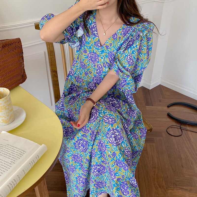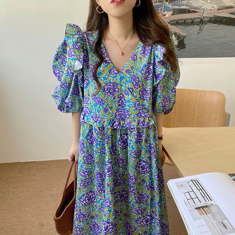 サマースタンダードVネックプリント柄ルーズスリーブドレス レディース レトロ 夏物 ステッチ 5/3 春夏 SS Neploe mi461618865947