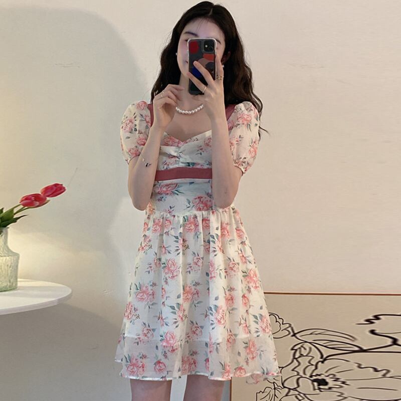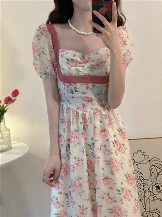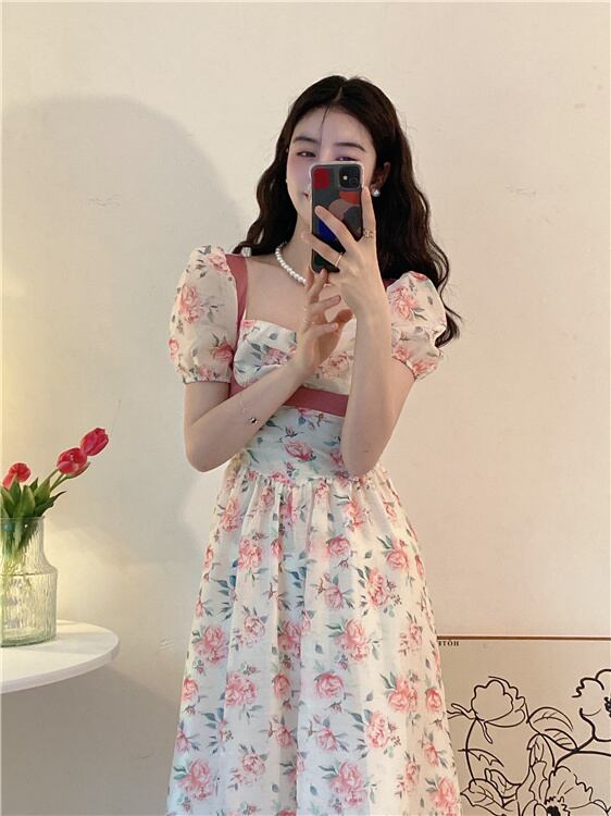 サマーカラーハイウェストウェスト薄手フローラルドレス エレガント 夏物 花柄 スクウェア 5/3 春夏 SS Neploe mi4692922047904