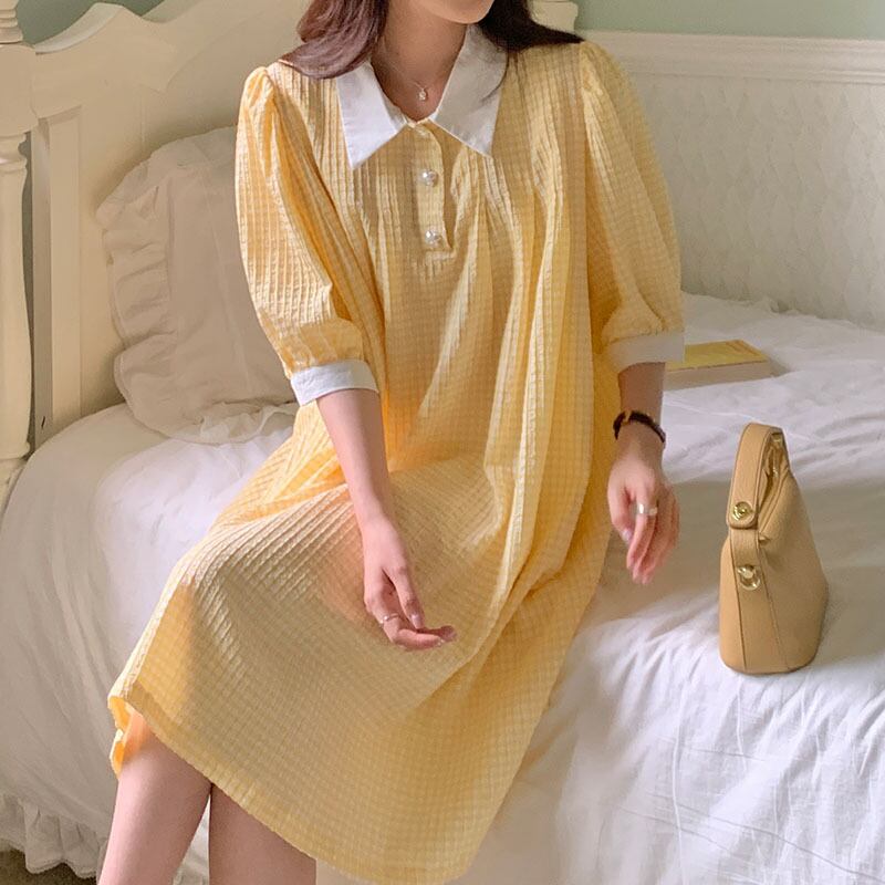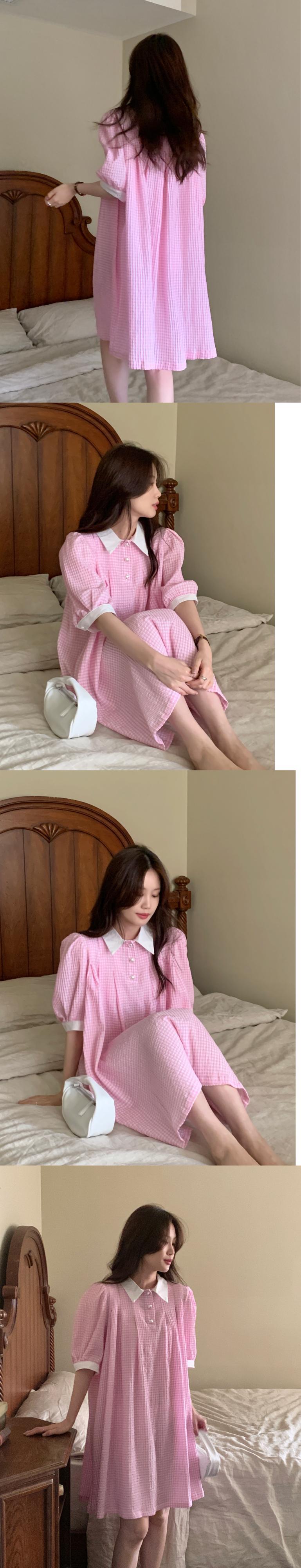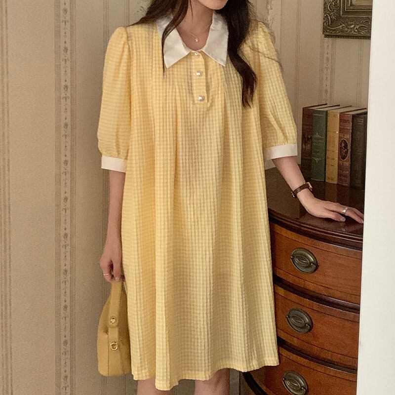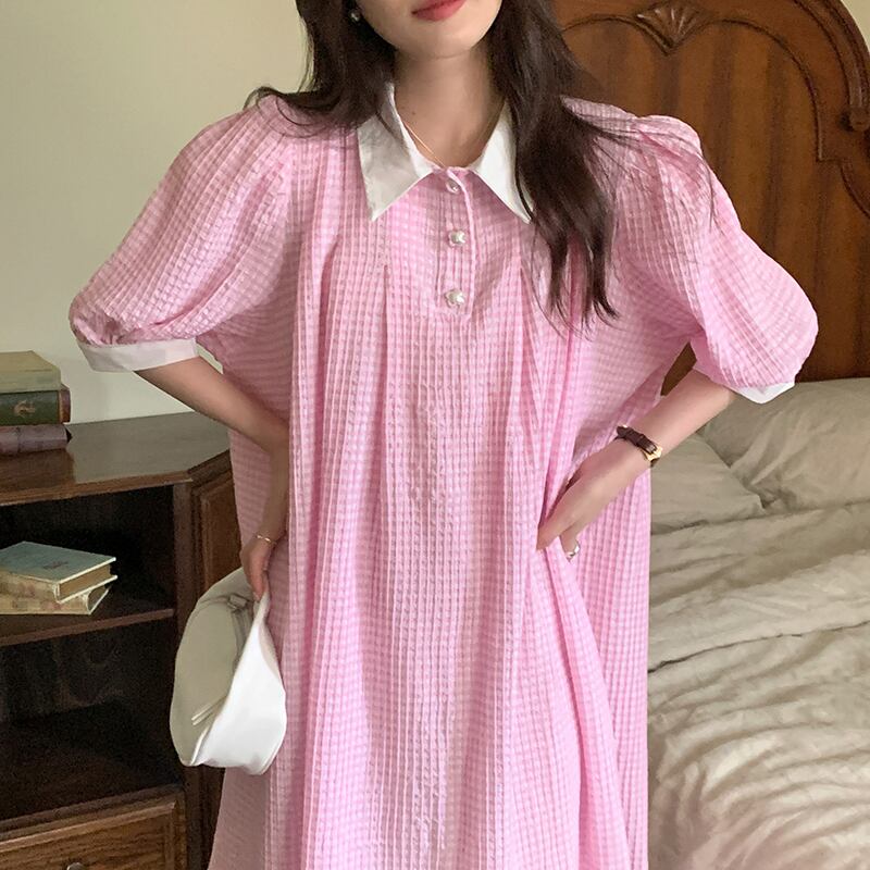 サマーカラーFlowerデザイン ボタンスリーブプリーツルーズ格子柄ドレス 大人ガーリー スウィート キュート カジュアル 夏物 フラワーデザイン 5/3 春夏 SS Neploe mi4699557934908