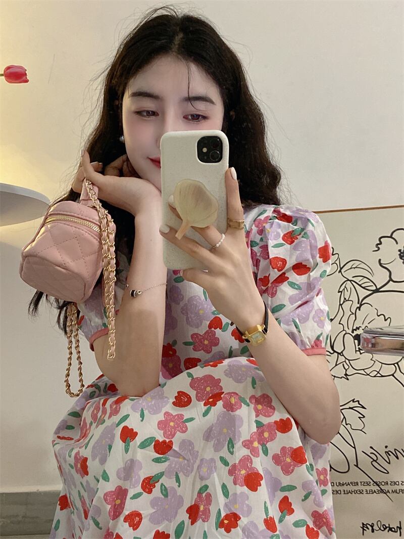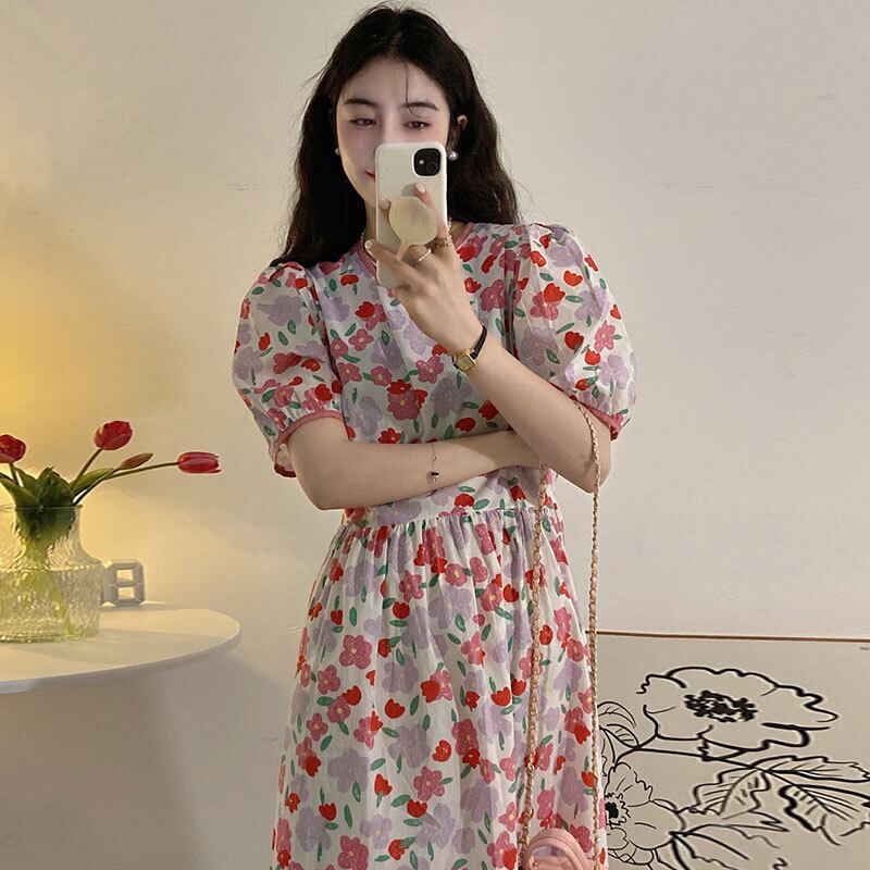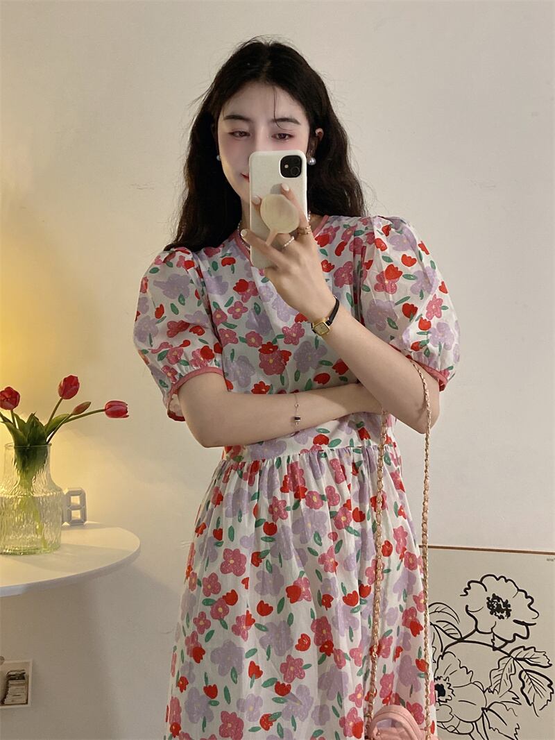 サマーラウンドネックカラーFlowerデザイン スリーブドレス 大人ガーリー スウィート キュート カジュアル 夏物 Oネック フラワーデザイン 5/3 春夏 SS Neploe mi4624517275973