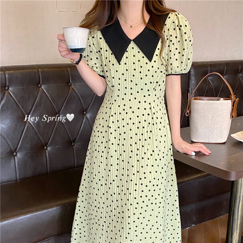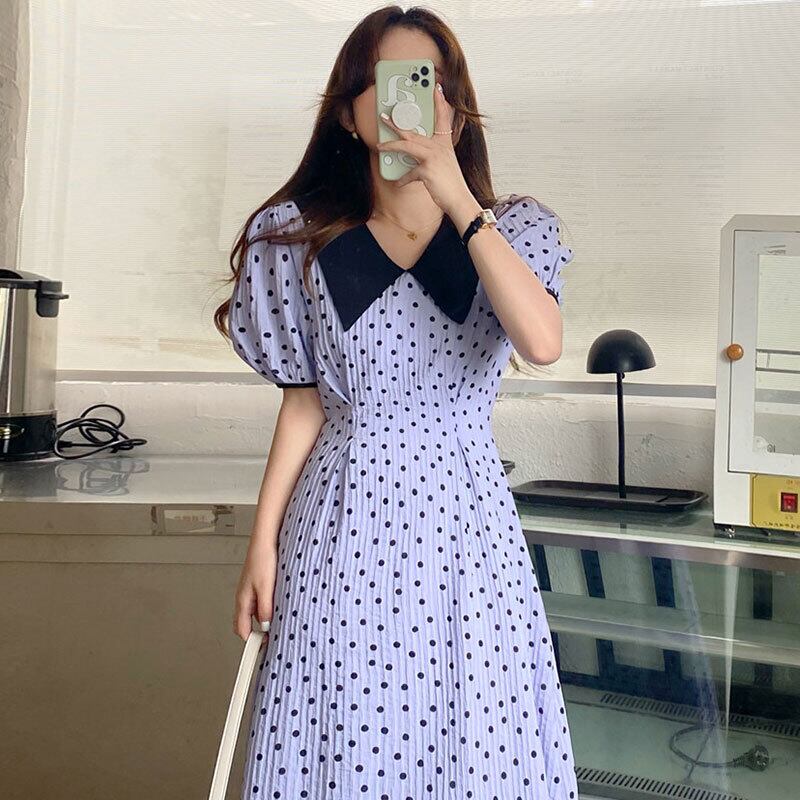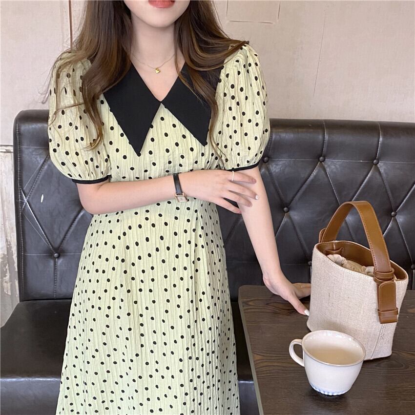 サマースタンダードカラーウェストスリムスリーブ水玉ドレス レトロ 夏物 5/3 春夏 SS Neploe mi4696784000559