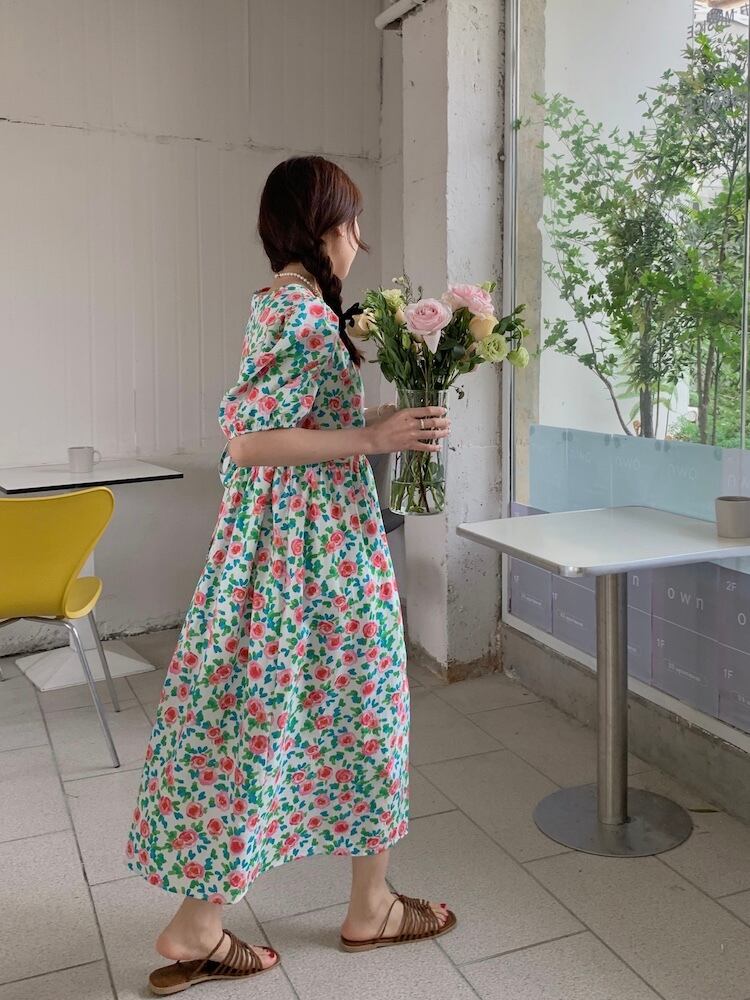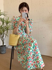 サマースタンダードラウンドネックプリント柄ハイウェストウェストスリムスリーブドレス レディース レトロ エレガント 夏物 Oネック 5/3 春夏 SS Neploe mi4643067870949