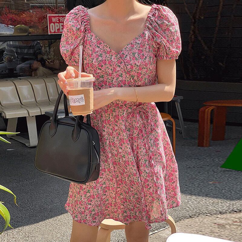 サマーカラーレースウェストスリーブフローラルドレス ショートスカート レディース エレガント 夏物 花柄 スクウェア 5/3 春夏 SS Neploe mi4689415840521