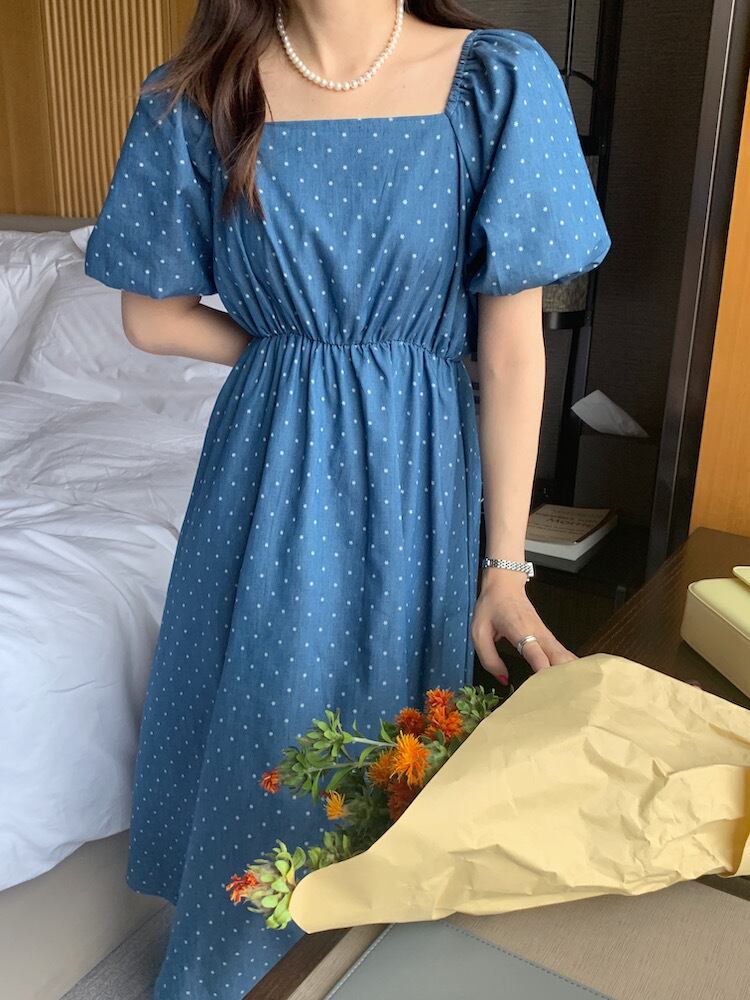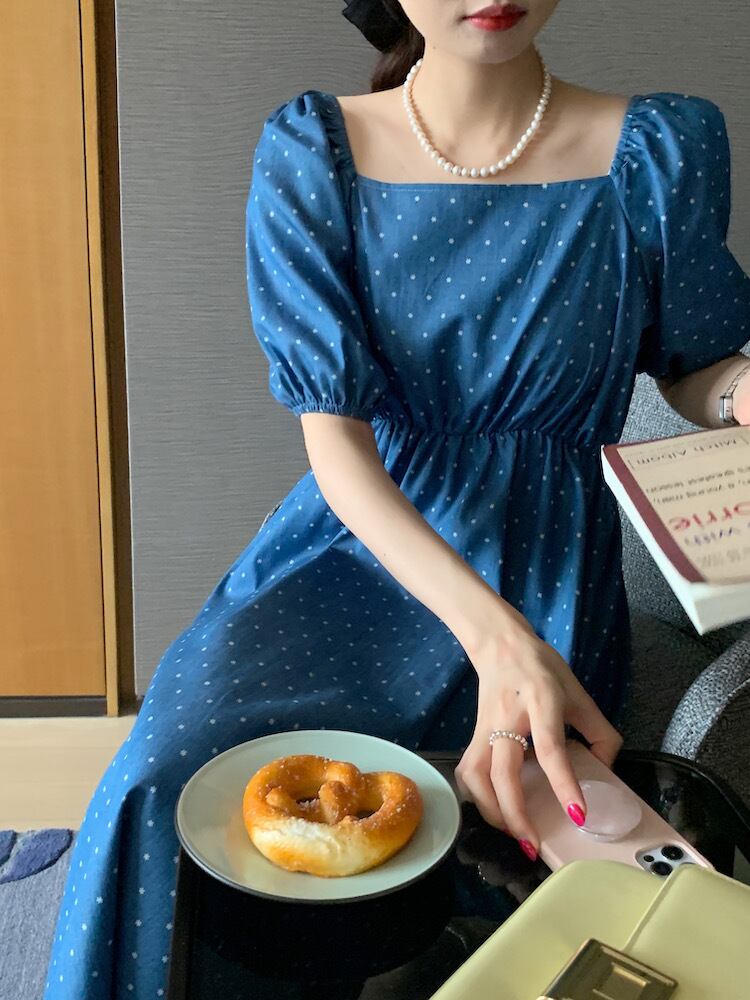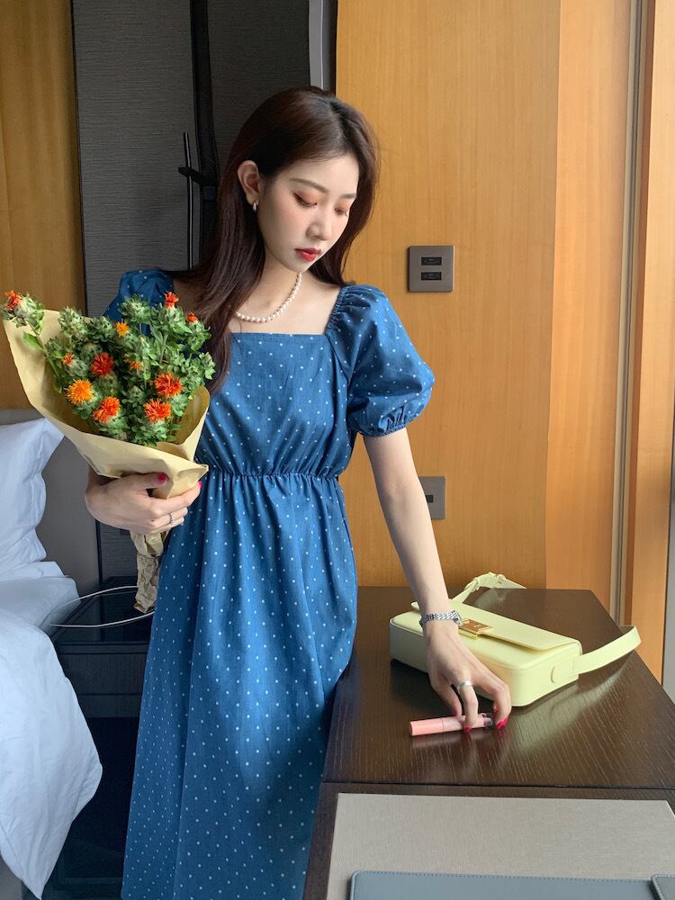 サマースタンダードカラーウェストスリムスリーブ水玉ドレス レトロ 夏物 スクウェア 5/3 春夏 SS Neploe mi4635870029248