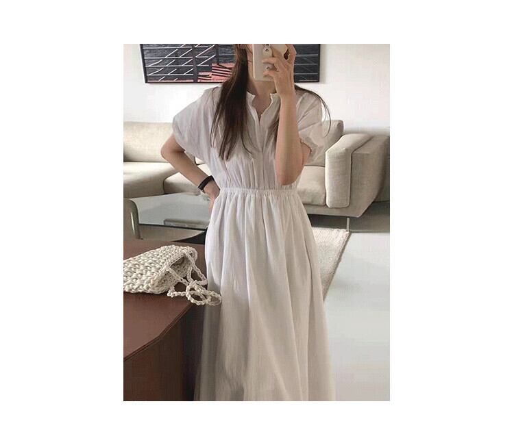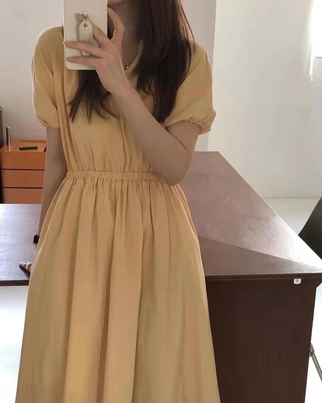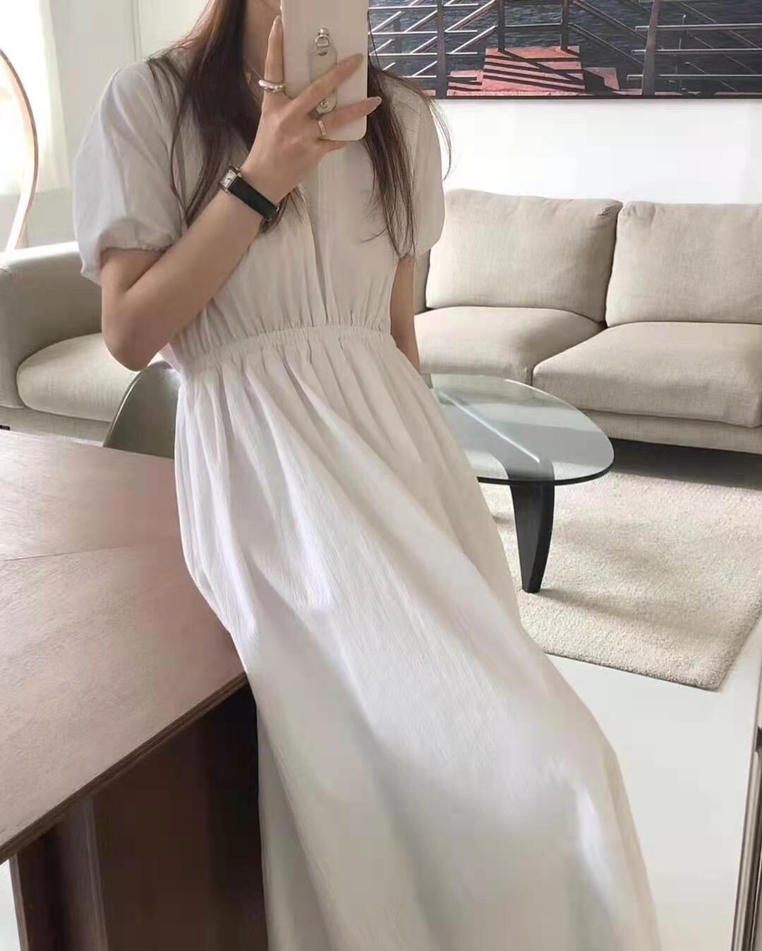 サマースタンダードVネックプリーツハイウェストウェストスリムスリーブロングドレス レディース レトロ 夏物 5/3 春夏 SS Neploe mi4683594930852