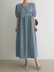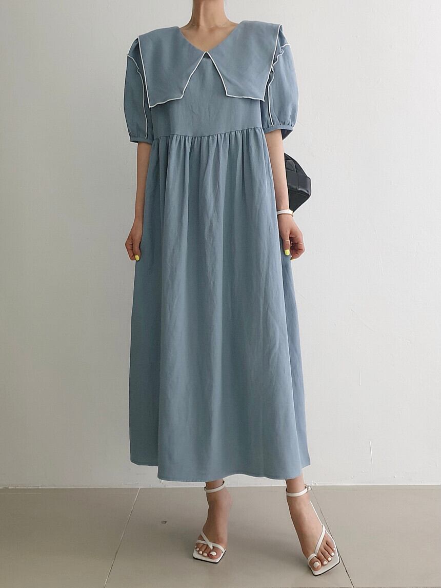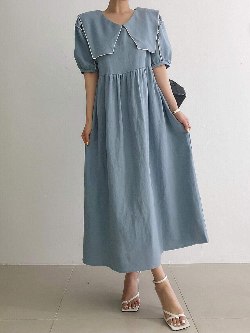 サマースタンダードネイビーカラープリーツウェストスリーブドレス ロングスカート レディース レトロ 夏物 5/3 春夏 SS Neploe mi4622593647591