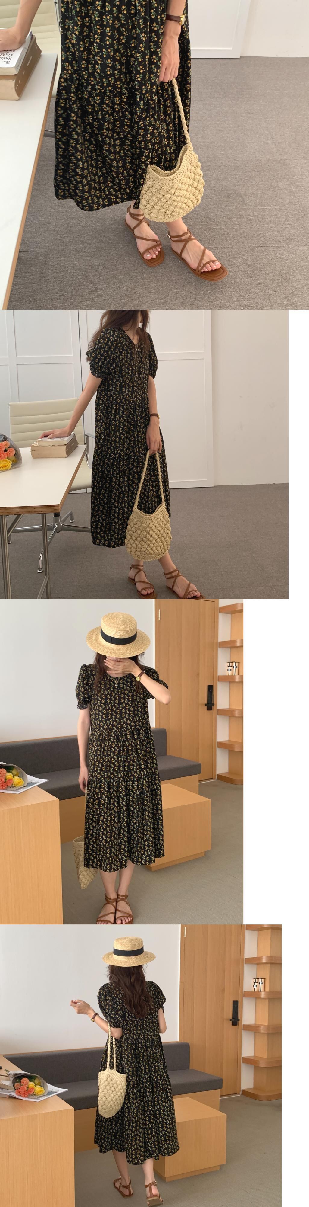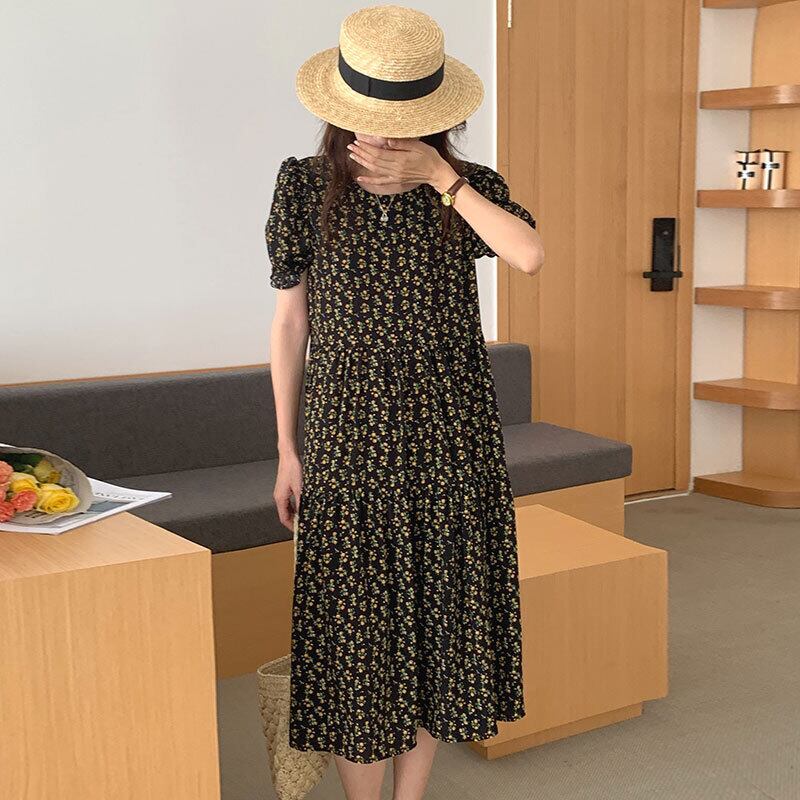サマースタンダードラウンドネックフローラルルーズカジュアルスリーブドレス ロングスカート レトロ エレガント 夏物 花柄 Oネック 5/3 春夏 SS Neploe mi4676845340705