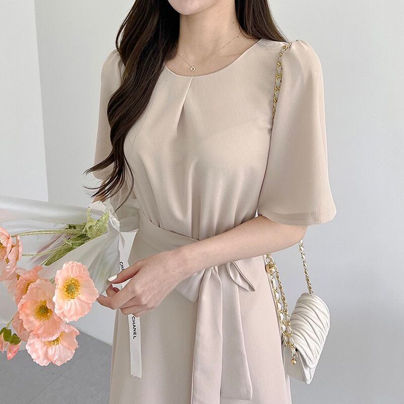サマーイエローラウンドネックリボンウェストスリーブAラインドレス ロングスカート レディース 夏物 Oネック 5/3 春夏 SS Neploe mi4616081129151