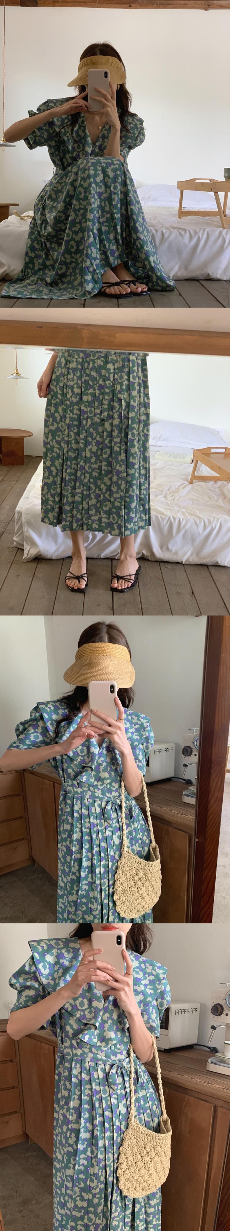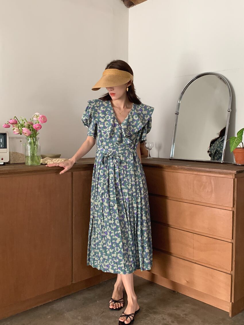 サマースタンダードVネックストラップ ウェストフローラルプリーツドレス レトロ エレガント 夏物 花柄 5/3 春夏 SS Neploe mi4663820512919