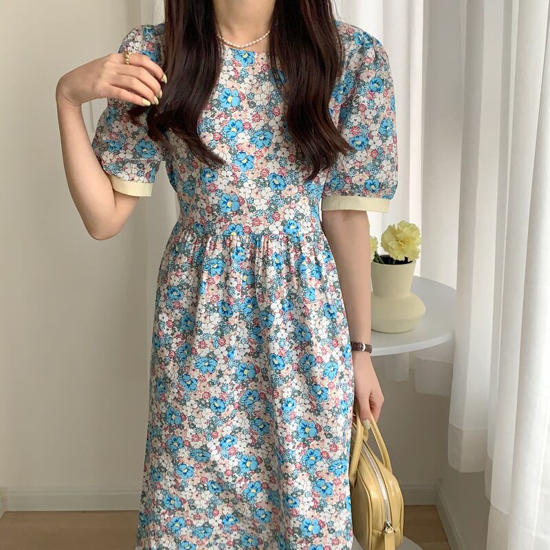 サマースタンダードラウンドネックフローラルウェストスリーブドレス レトロ エレガント 夏物 花柄 Oネック 5/3 春夏 SS Neploe mi4653774933881
