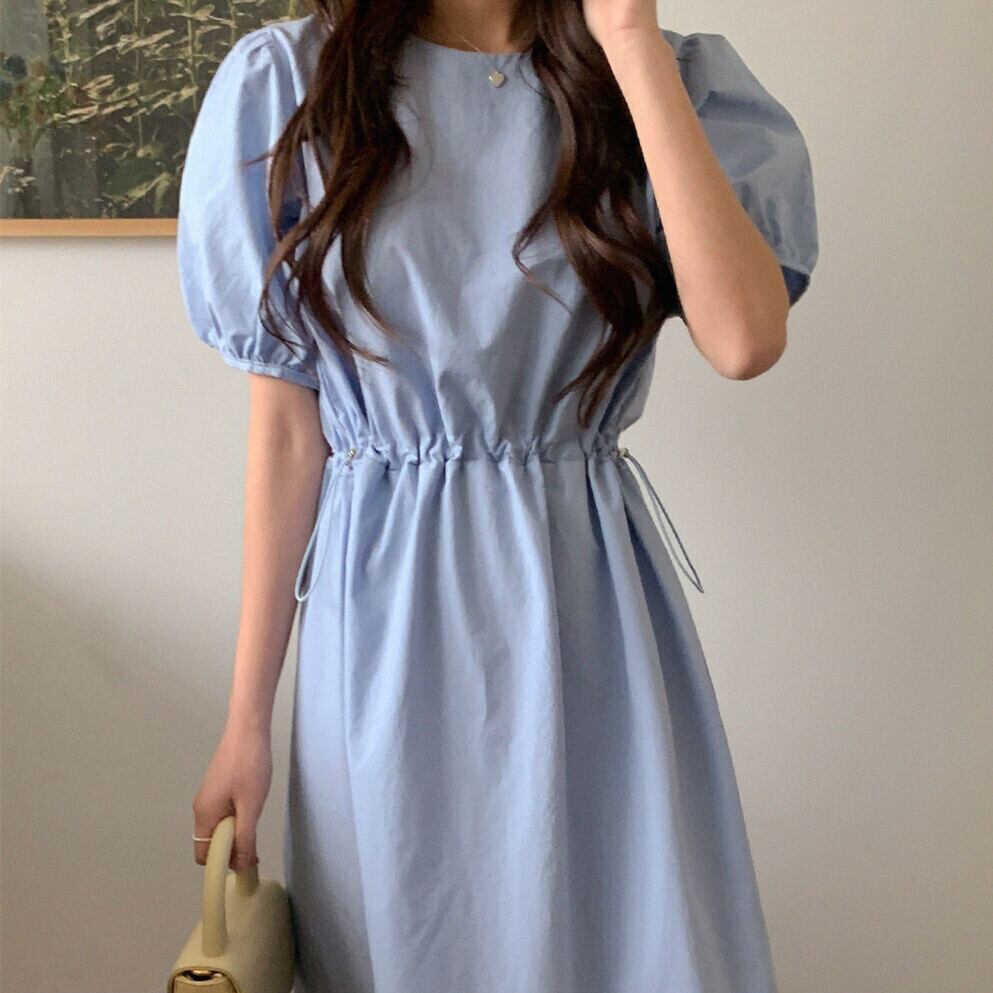 サマーラウンドネックギャザーウェスト薄手ロングスリーブドレス 夏物 Oネック 5/3 春夏 SS Neploe mi4621982382679
