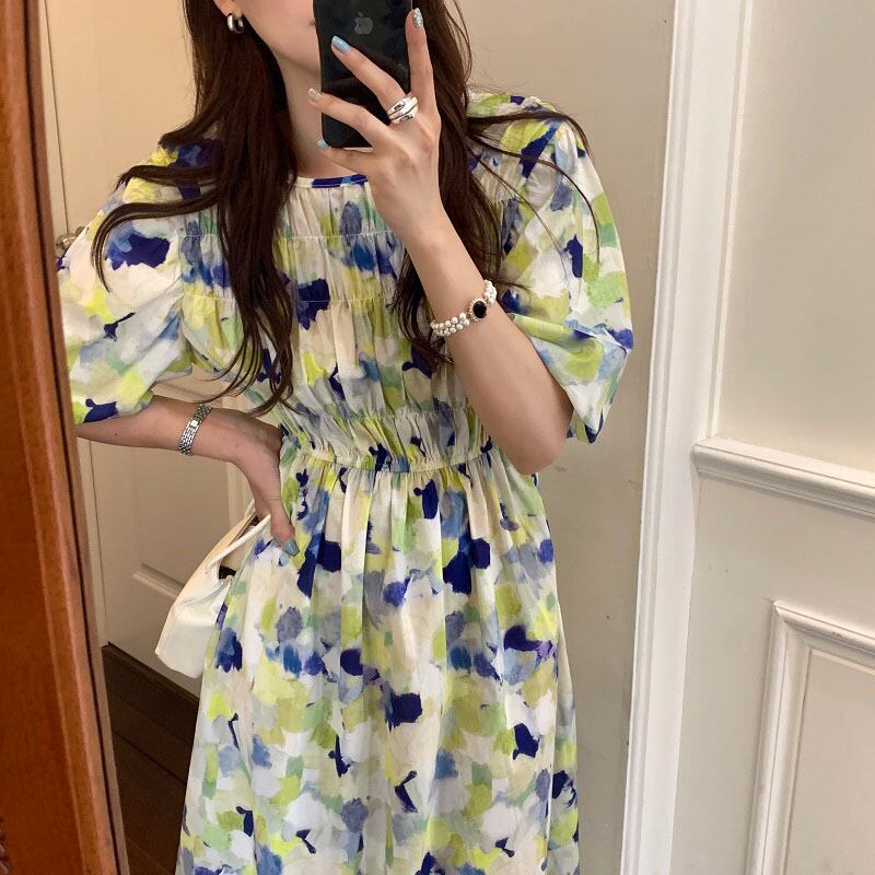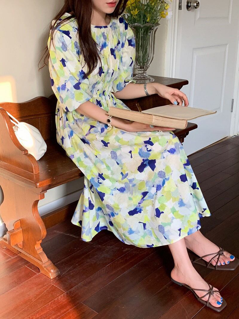 サマーラウンドネックウェスト薄手プリントスリーブドレス エレガント 夏物 Oネック 5/3 春夏 SS Neploe mi4622950146365