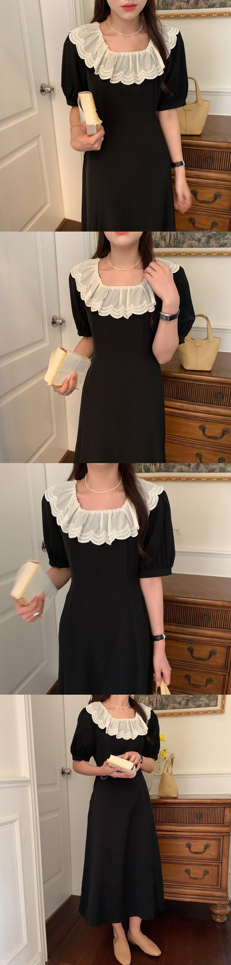 スタンダードカラーレースウェストスリーブドレス ロングスカート レトロ スクウェア ステッチ 5/3 春夏 SS Neploe mi4632584435190