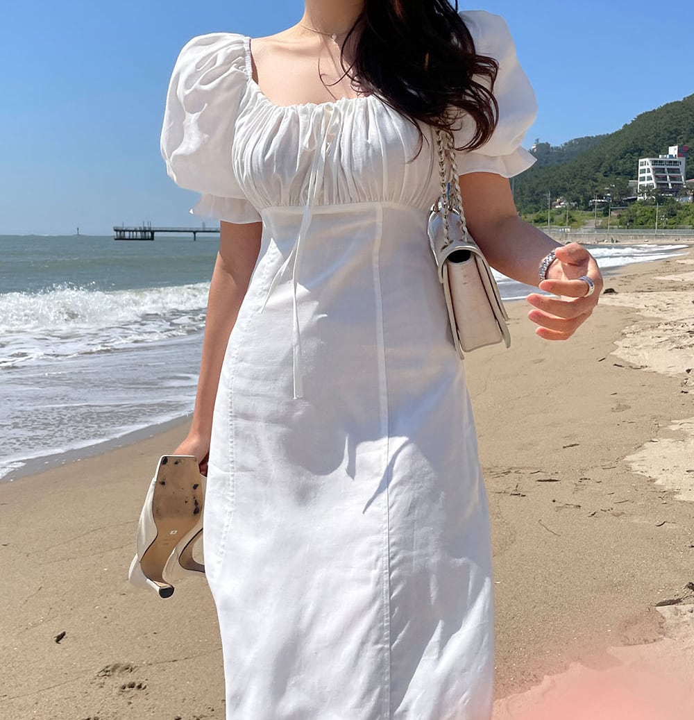 サマープリーツハイウェストウェストスリムスリーブロングドレス レディース エレガント 夏物 スクウェア 5/3 春夏 SS Neploe mi4614043711495