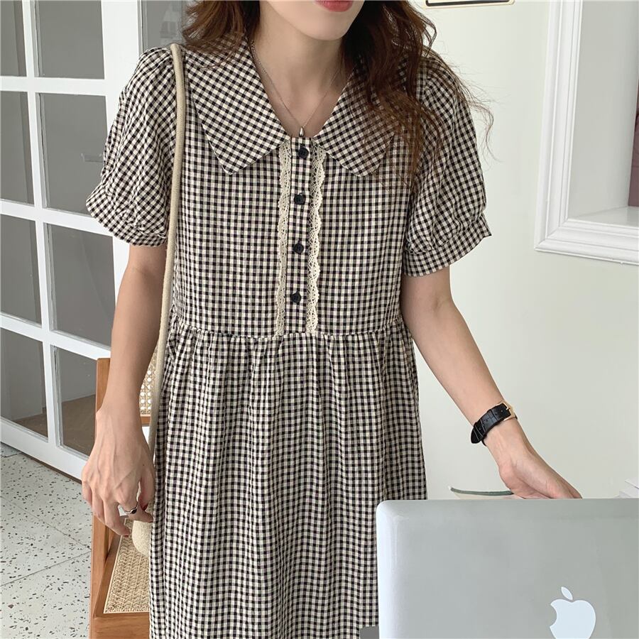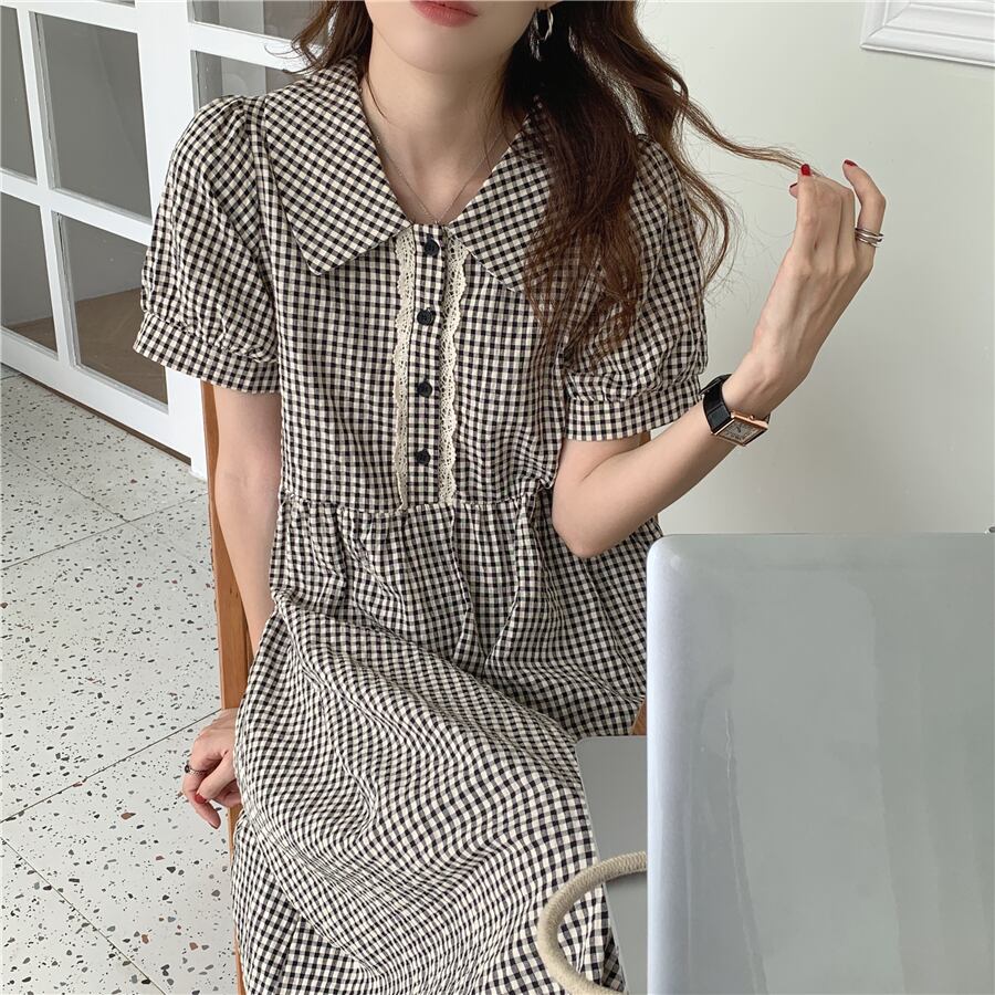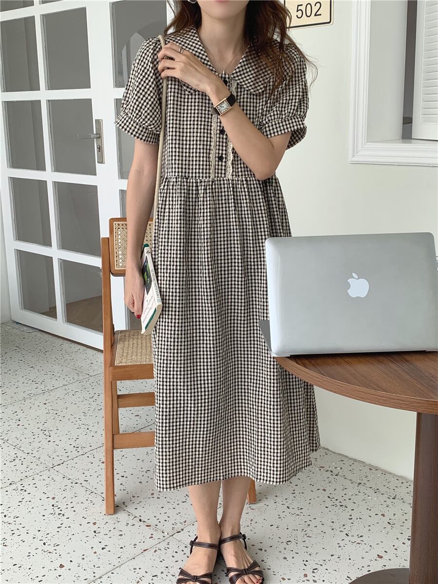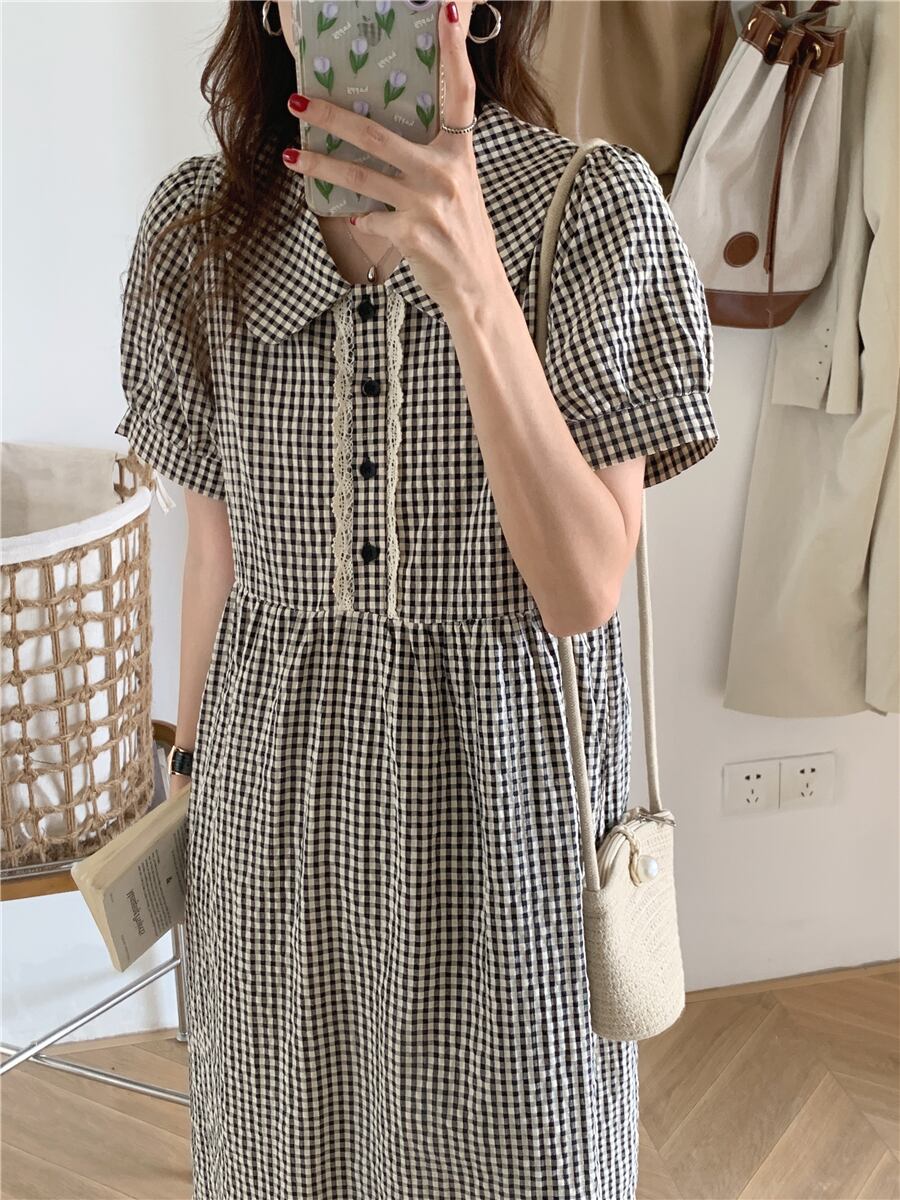 サマースタイルレースブラックホワイト格子柄スリーブロングドレス レディース 夏物 ステッチ 5/3 春夏 SS Neploe mi4669287652785