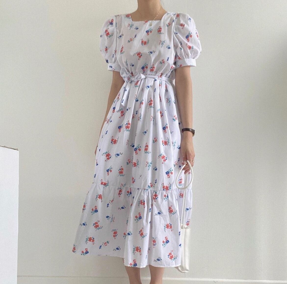 サマーカラーバンドウェストスリーブフローラルドレス 大人ガーリー スウィート キュート カジュアル 夏物 花柄 スクウェア ステッチ 5/3 春夏 SS Neploe mi4629107368939