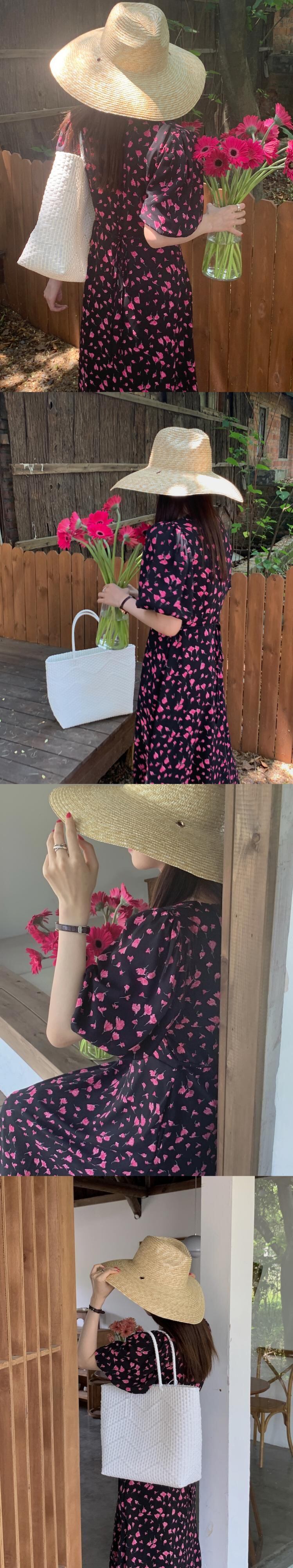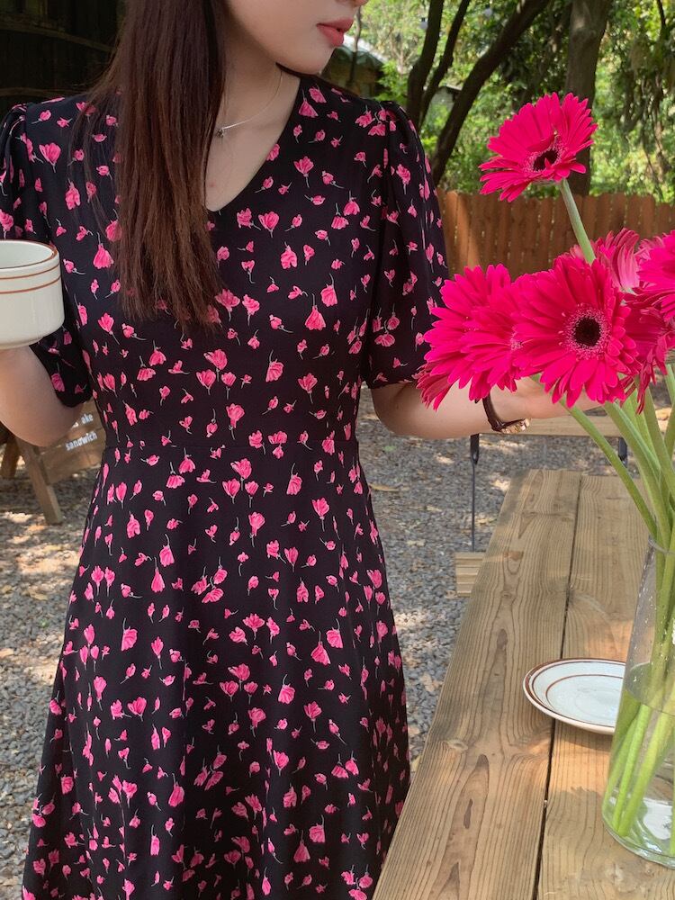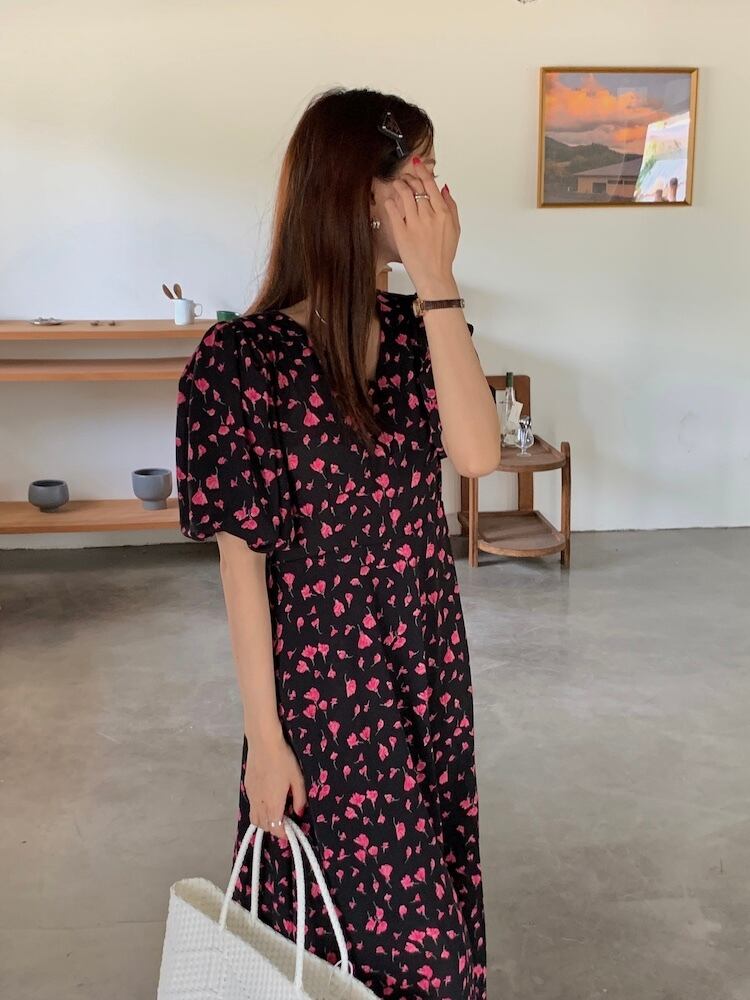 サマースタンダードVネックカラーFlowerデザイン ポケットスリーブドレス ロングスカート レトロ エレガント 夏物 フラワーデザイン 5/3 春夏 SS Neploe mi462450706163