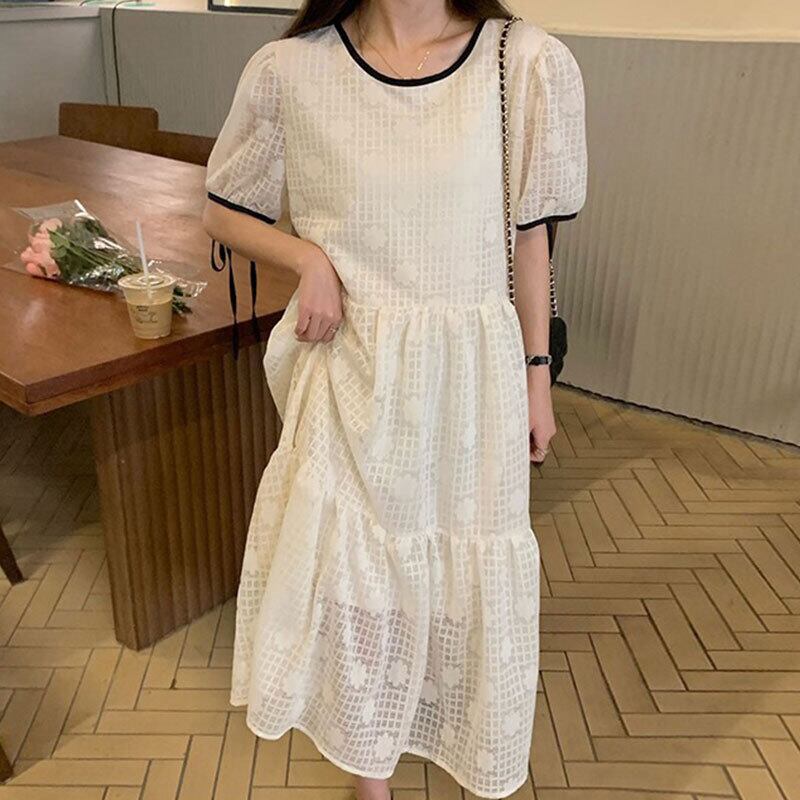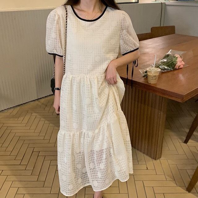 サマーラウンドネックメッシュレースリボンスリーブドレス 大人ガーリー スウィート キュート カジュアル 夏物 Oネック 5/3 春夏 SS Neploe mi4687759878318