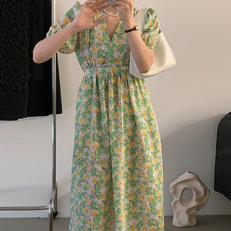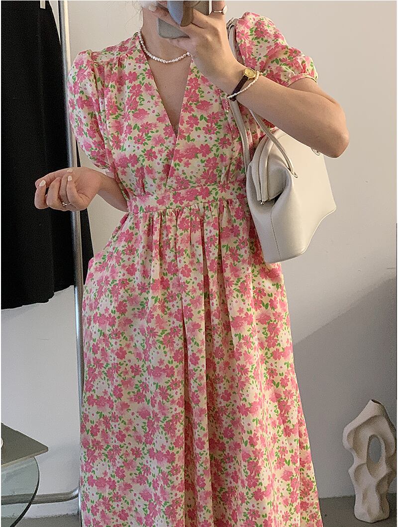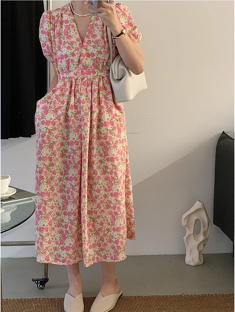 サマーVネックプリーツウェストポケットスリーブフローラルドレス レディース 大人ガーリー スウィート キュート カジュアル 夏物 花柄 5/3 春夏 SS Neploe mi465833886392