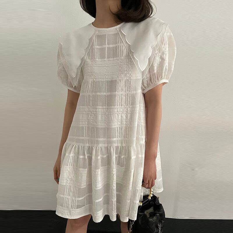 サマー刺繍格子柄レースFlowerデザイン スリーブラッフルドレス 夏物 フラワーデザイン 5/3 春夏 SS Neploe mi4648820630371