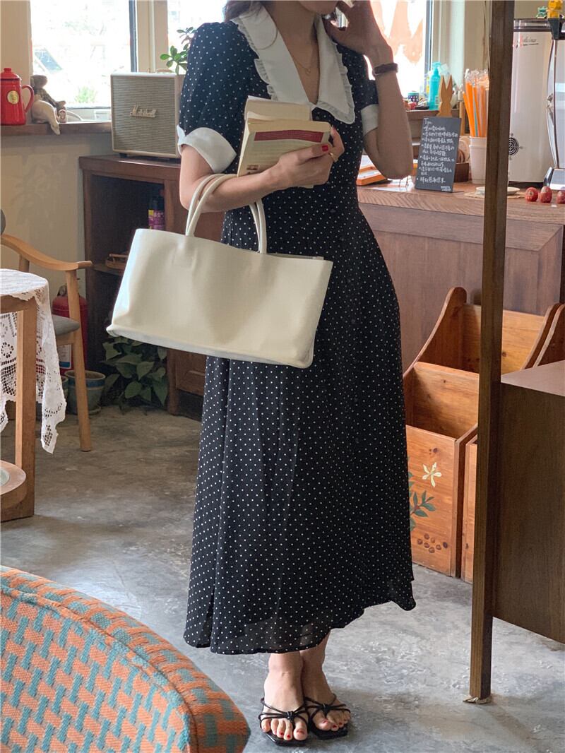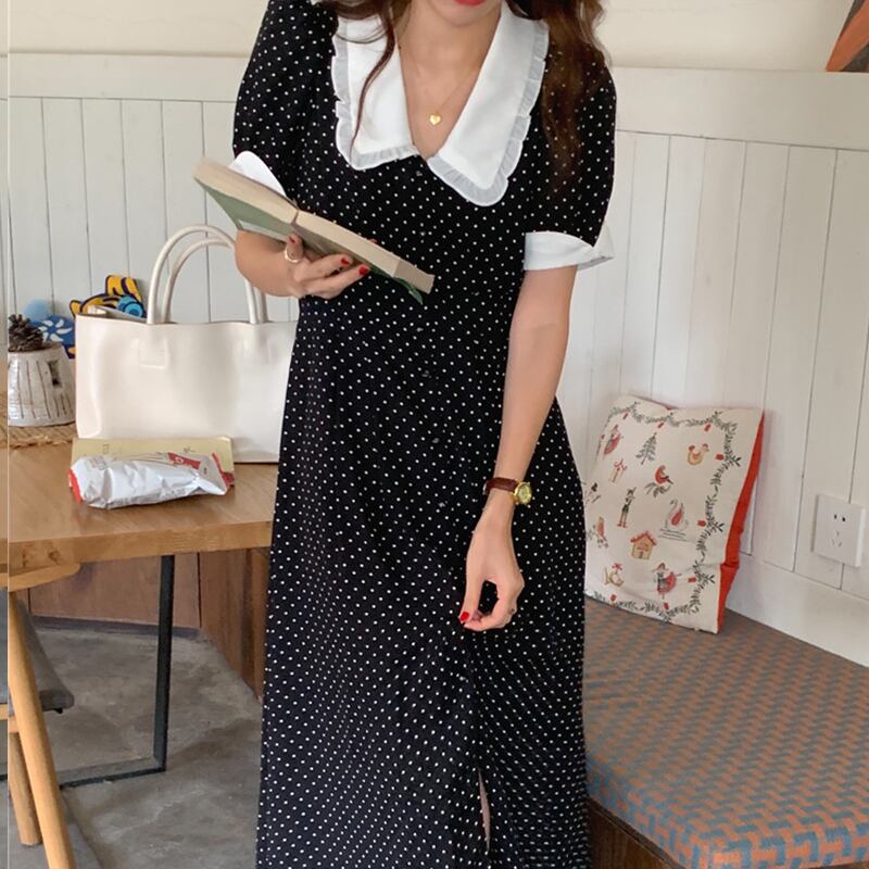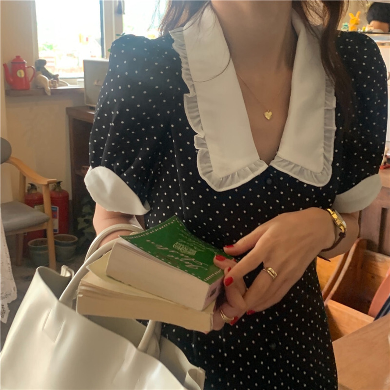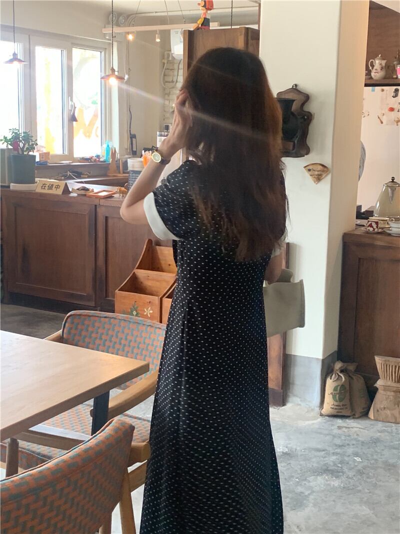 サマースタンダードカラーウェスト薄手水玉ドレス ロングスカート レディース レトロ 夏物 5/3 春夏 SS Neploe mi4672352271382