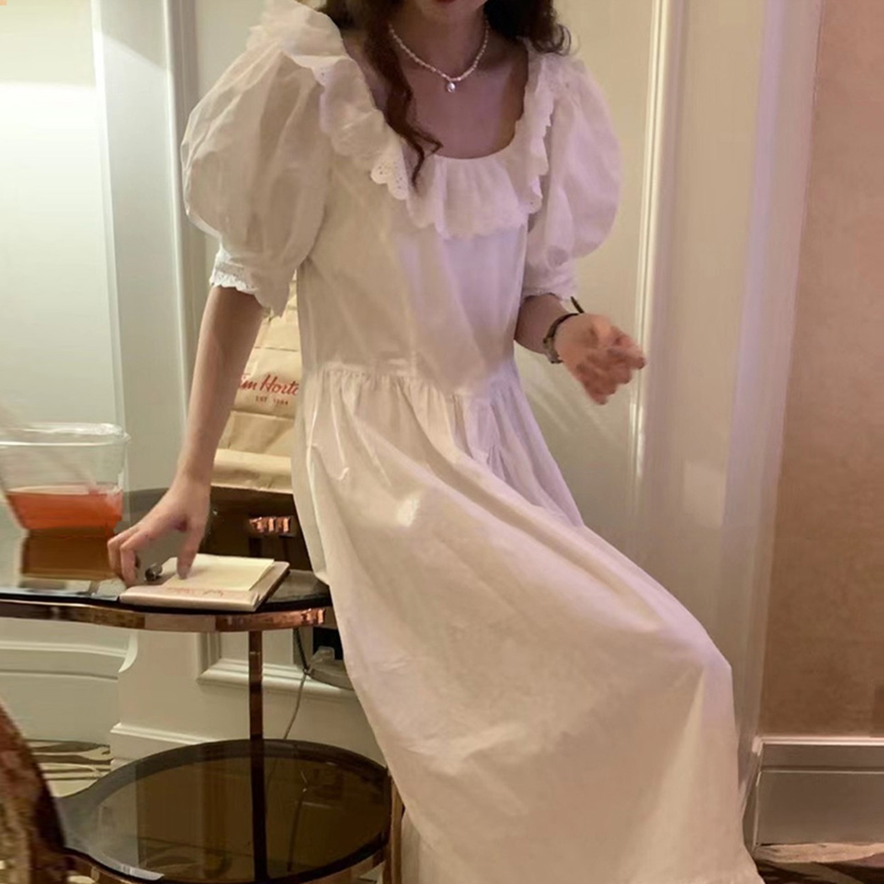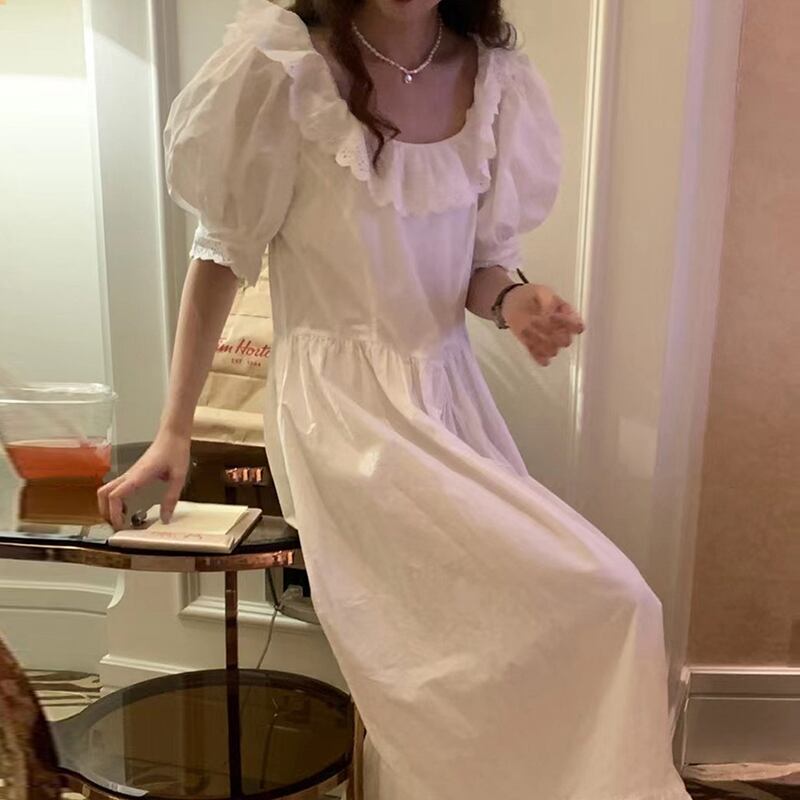 サマーレースハイウェストウェストスリムスリーブロングドレス エレガント 夏物 スクウェア ステッチ 5/3 春夏 SS Neploe mi4646646536341