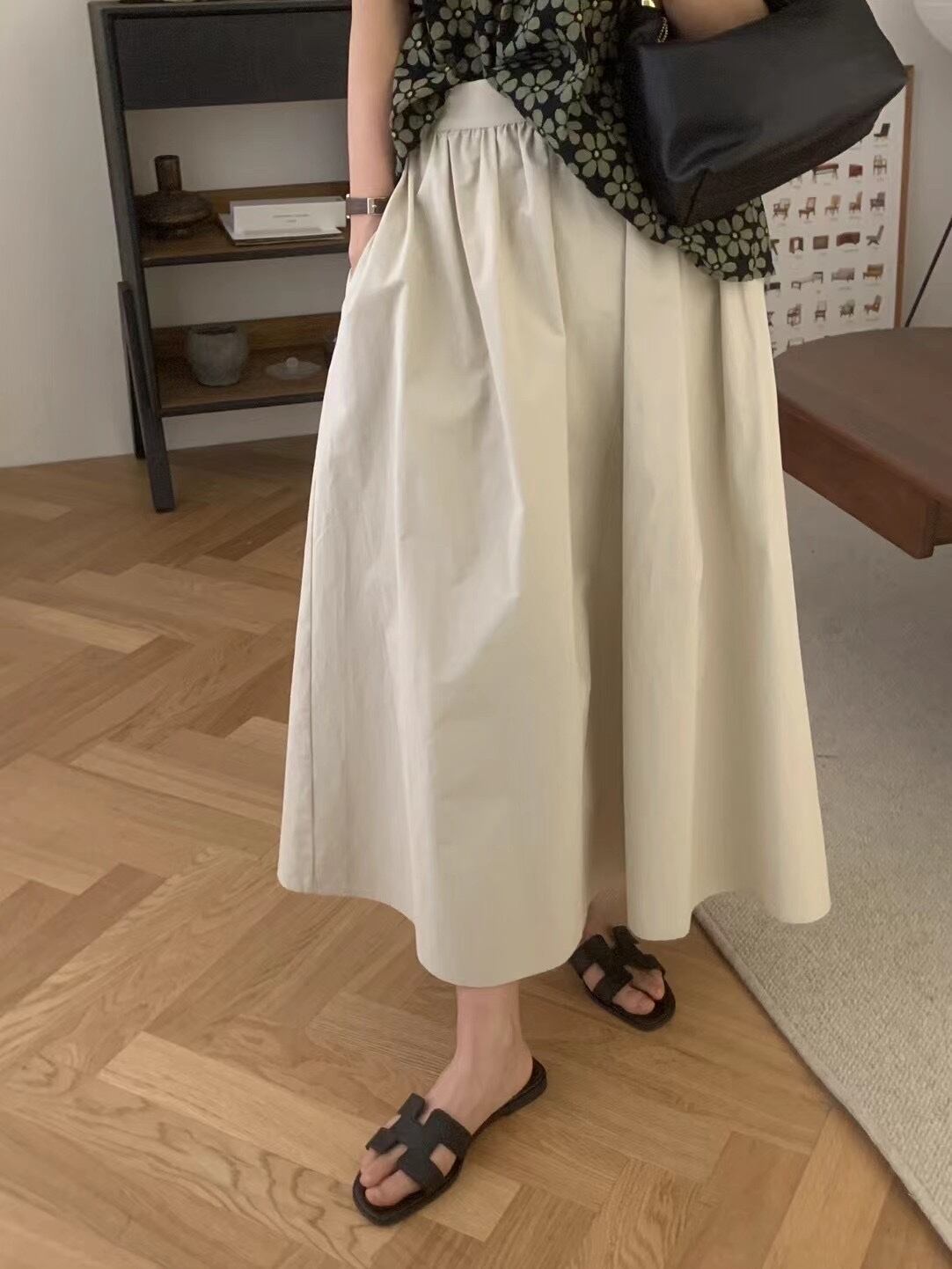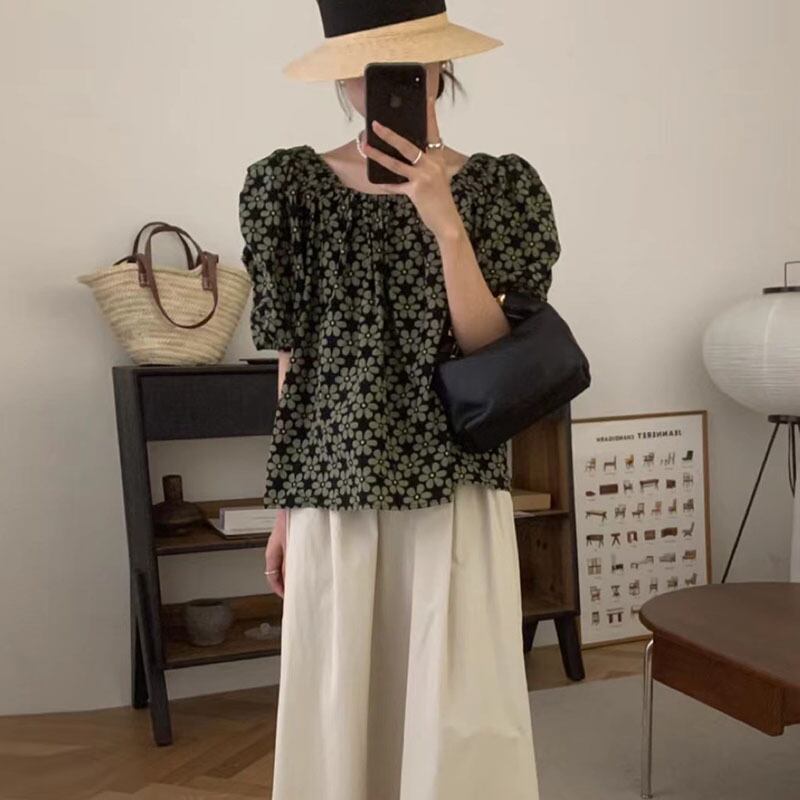 スタンダードラウンドネックスリーブフローラルシャツ ハイウェストウェストプリーツルーズスカート レトロ 花柄 Oネック 5/3 春夏 SS Neploe mi4683848857249