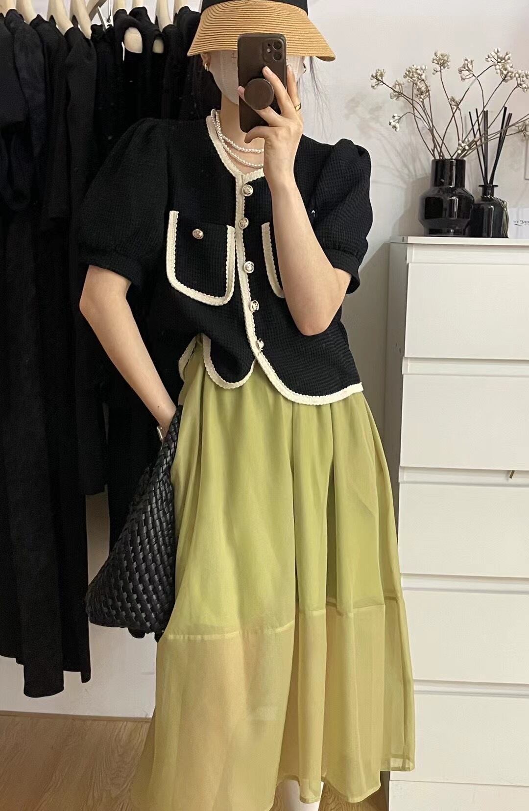 サマースタンダードラウンドネックパールボタンショートコート ハイウェストウェストロングスカート レディース レトロ 夏物 Oネック 真珠 5/3 春夏 SS Neploe mi463744853389