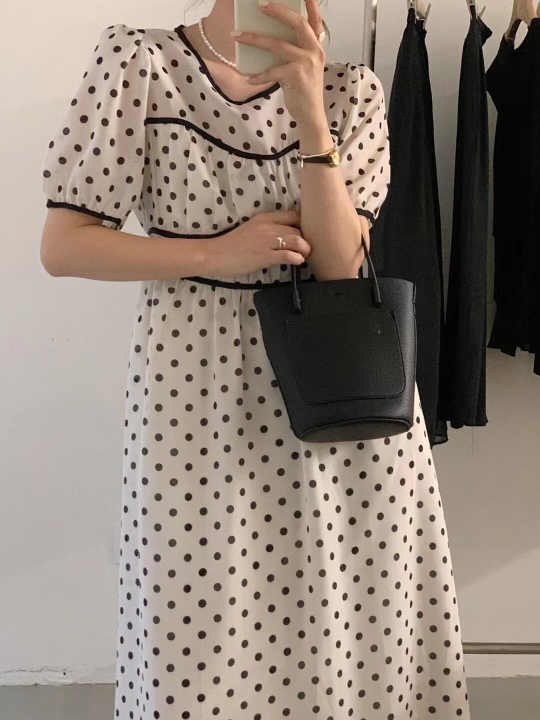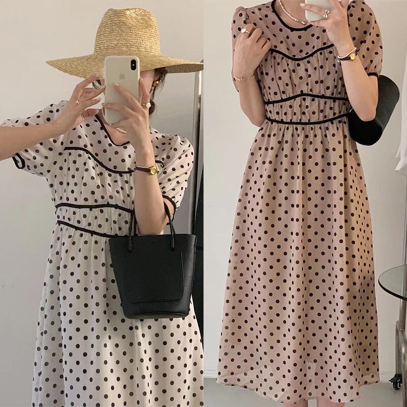 サマーラウンドネックカラーウェストスリムスリーブドレス エレガント 夏物 Oネック 5/3 春夏 SS Neploe mi4699464611350