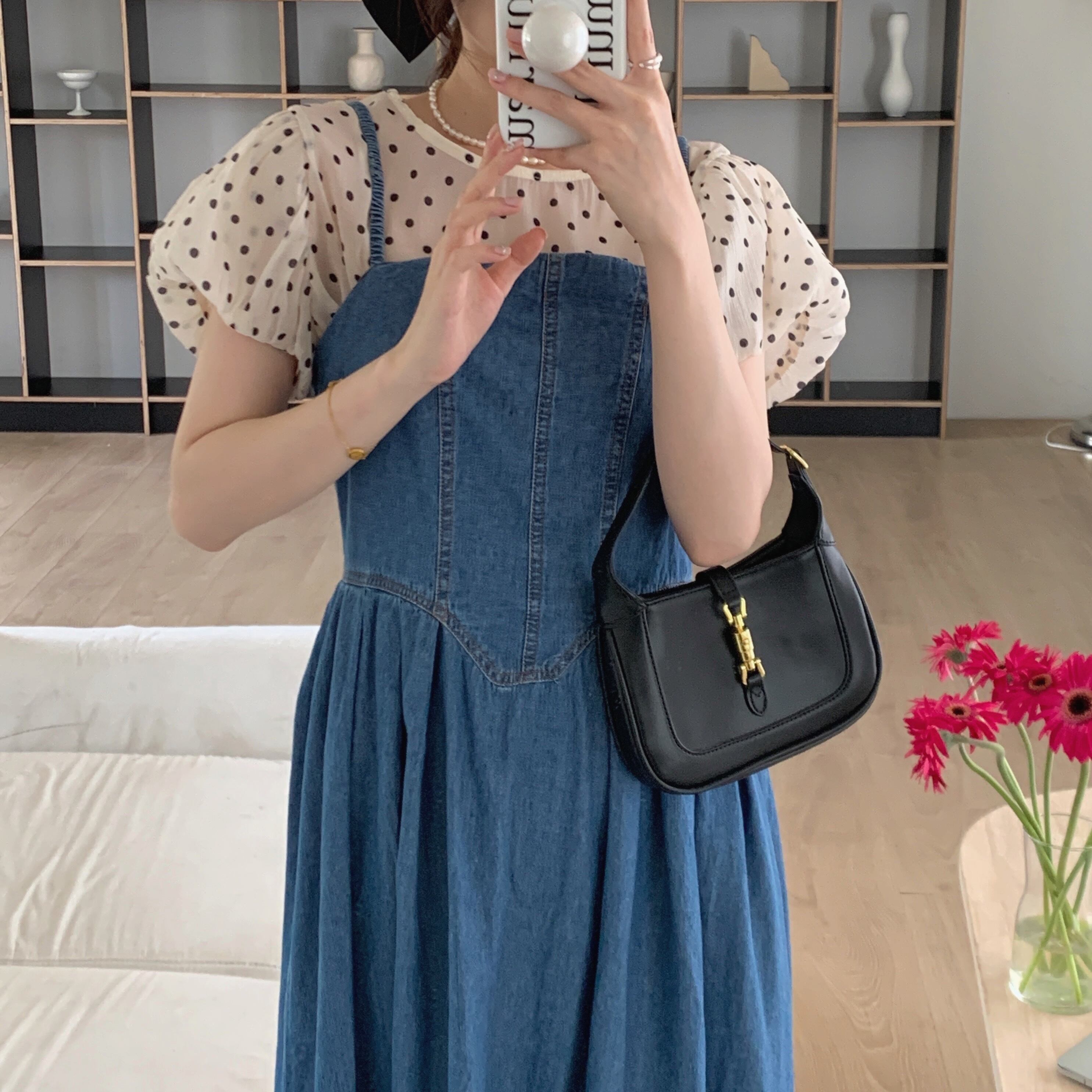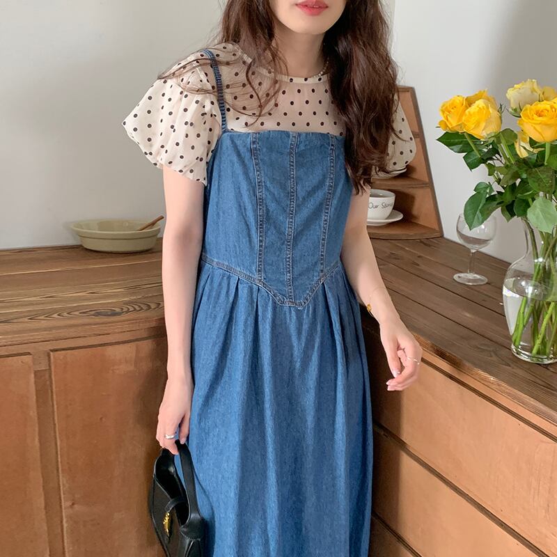 ラウンドネック水玉スリーブシャツ ハイウェストウェストドレス 大人ガーリー スウィート キュート カジュアル Oネック 5/3 春夏 SS Neploe mi4654317570932