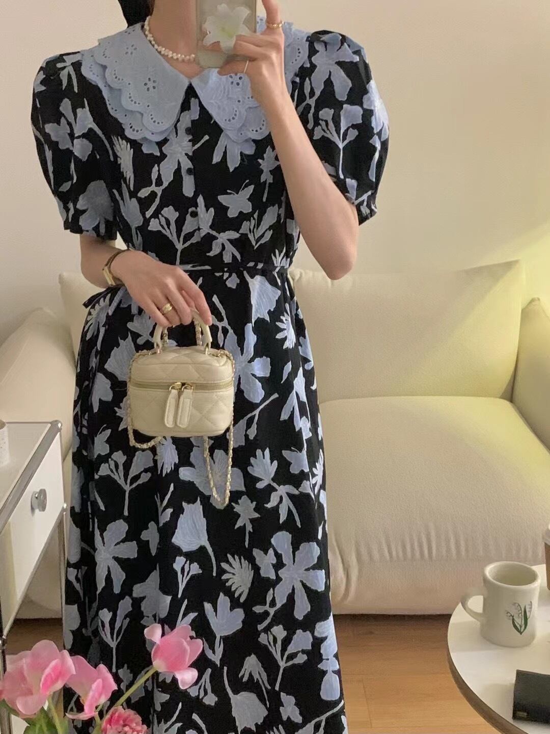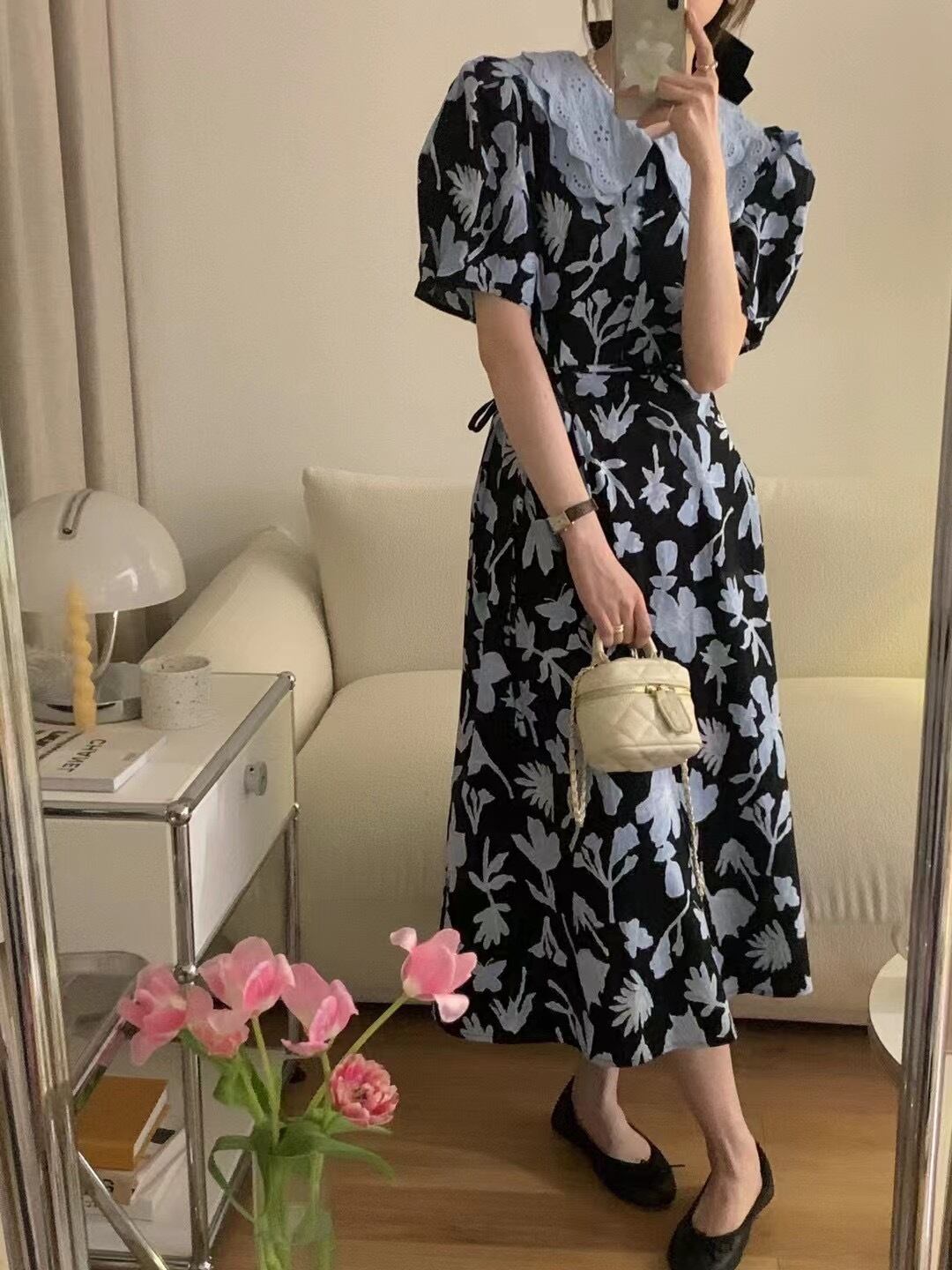 サマースタンダードカラーレースウェストプリント柄ドレス レトロ エレガント 夏物 5/3 春夏 SS Neploe mi464108741129