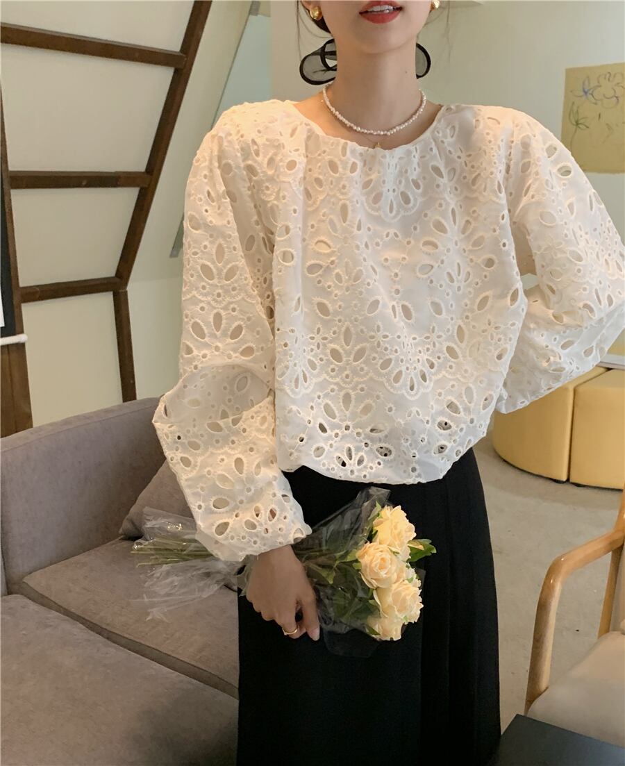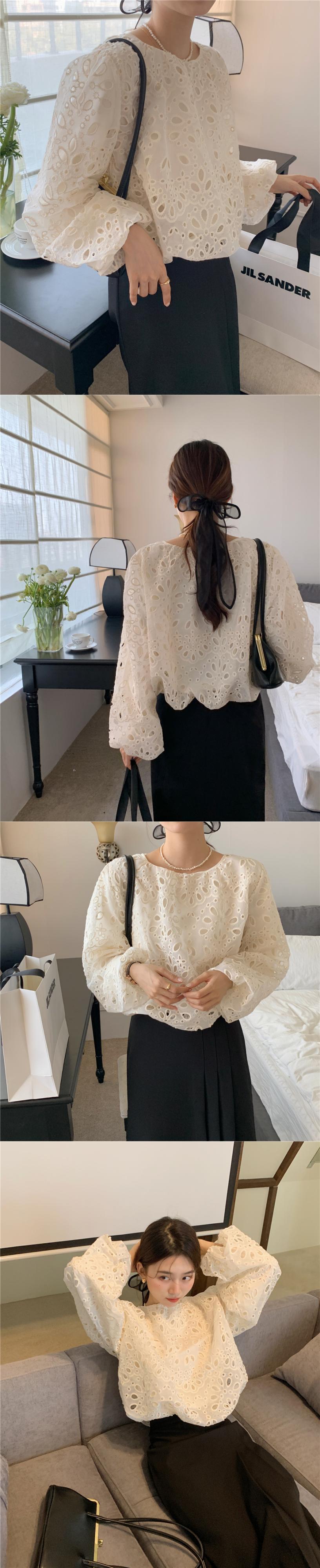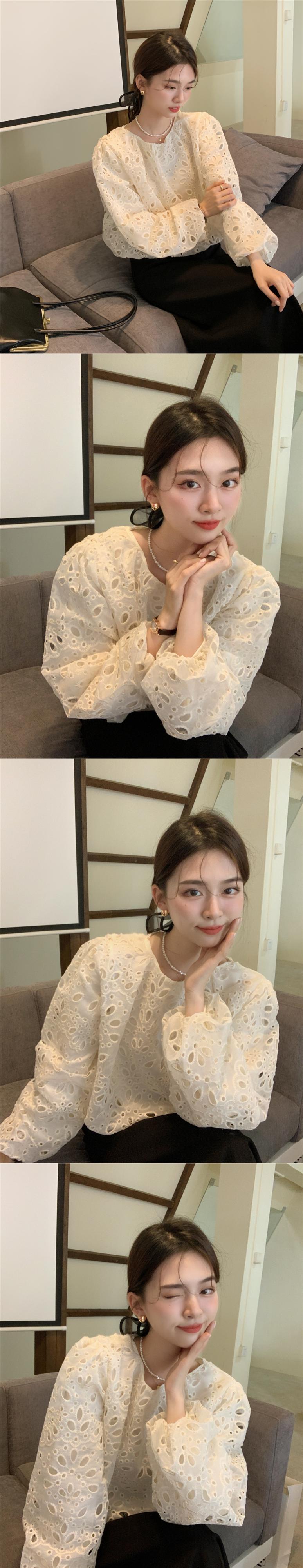 スプリングスタンダードラウンドネックレースルーズスリーブシャツ トップス レディース ランタンスリーブ レトロ 春物 Oネック 5/3 春夏 SS Neploe mi4621221195873