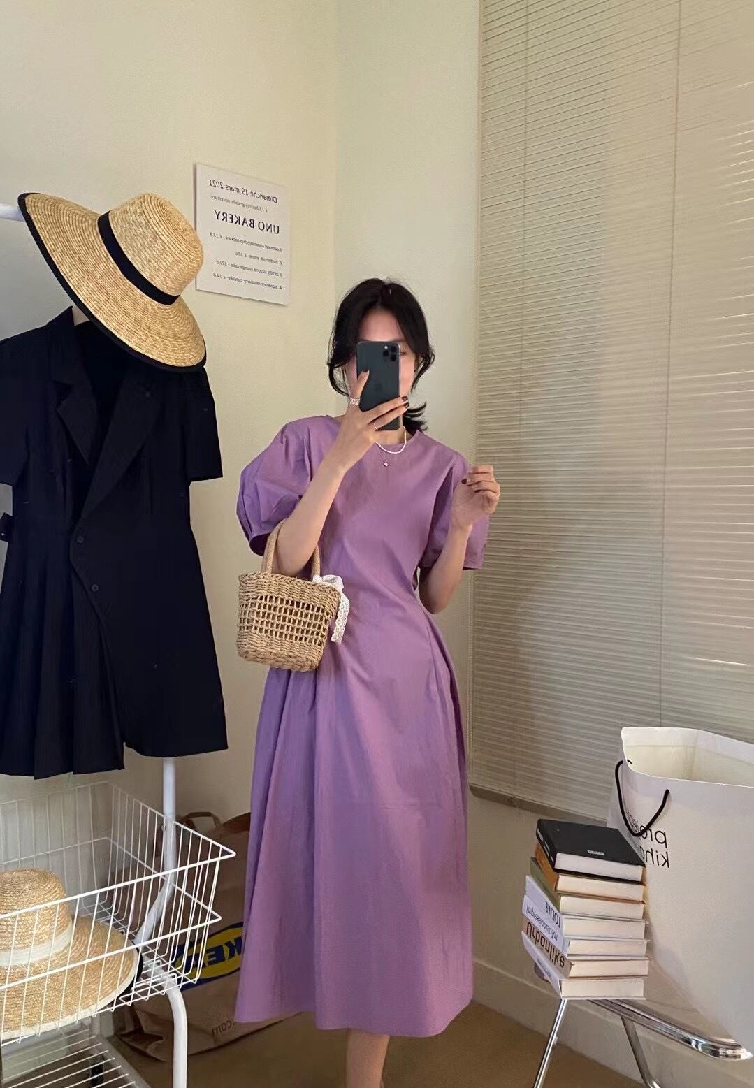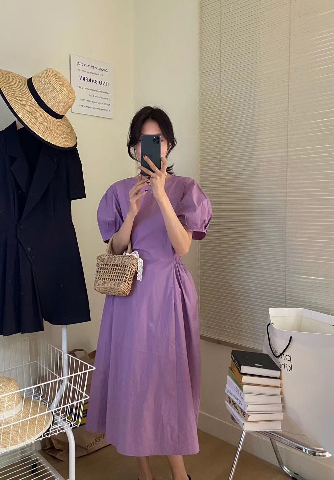 サマーラウンドネックプリーツウェスト薄手ダブルポケットスリーブロングドレス レディース エレガント 夏物 Oネック 5/3 春夏 SS Neploe mi4698333577544