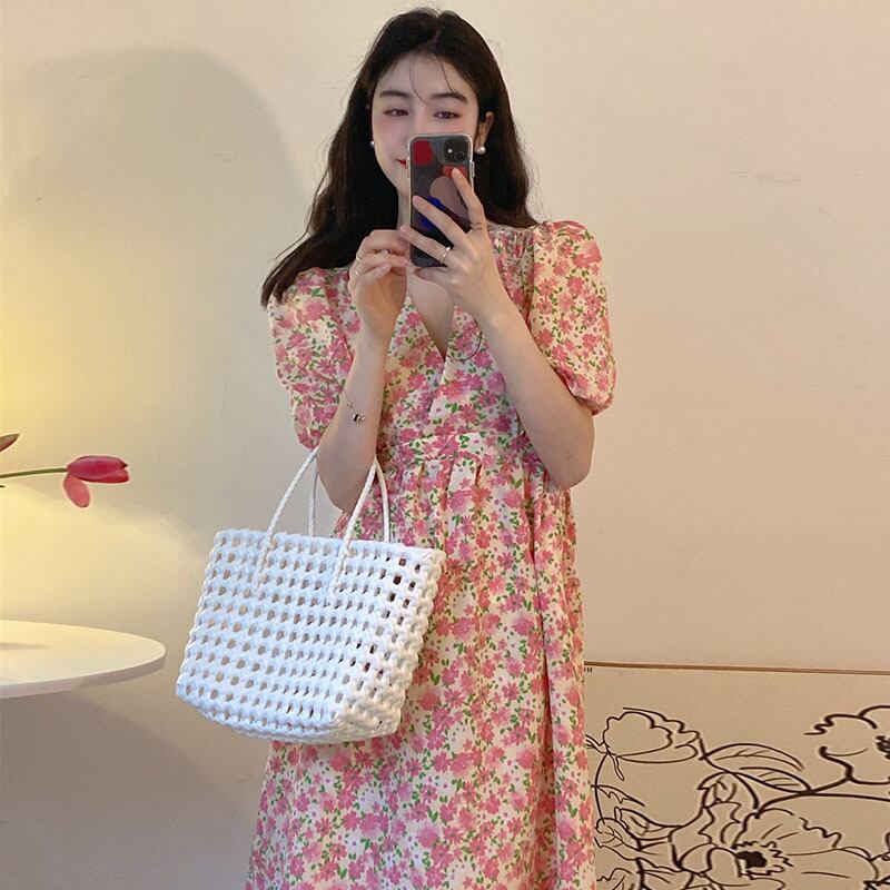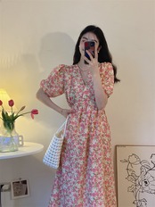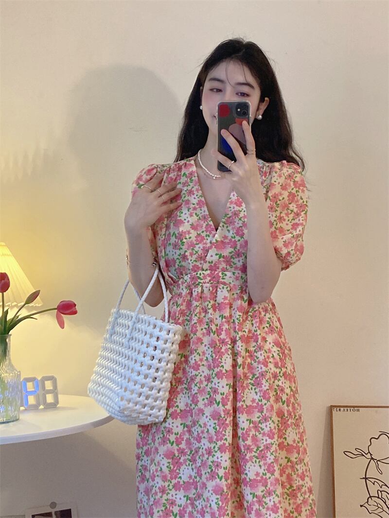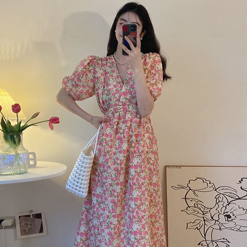 サマーVネックプリーツウェスト薄手フローラルドレス ロングスカート 大人ガーリー スウィート キュート カジュアル 夏物 花柄 5/3 春夏 SS Neploe mi461766841650