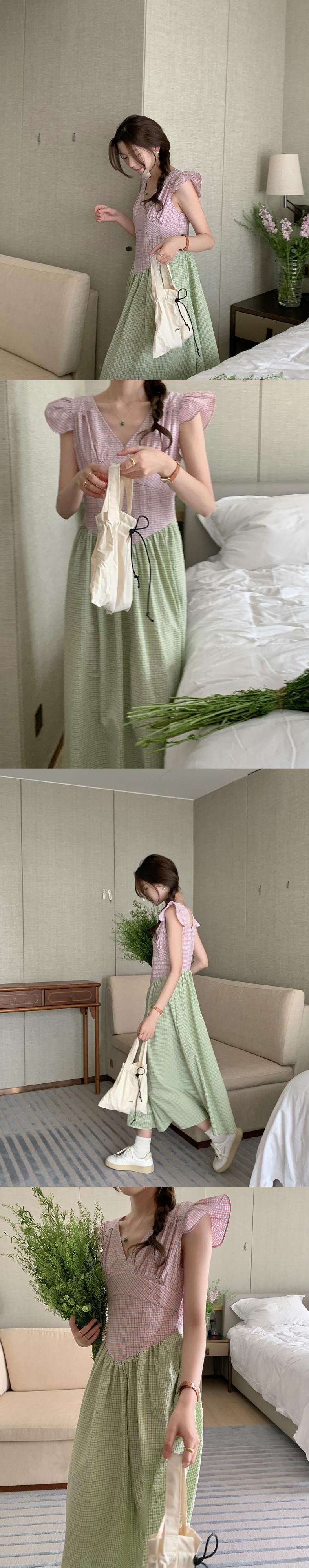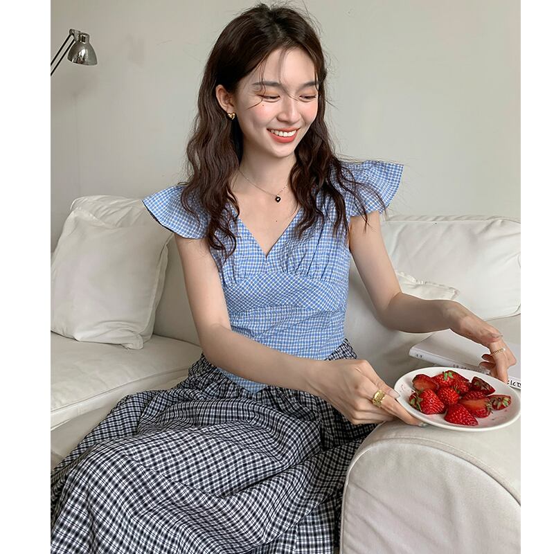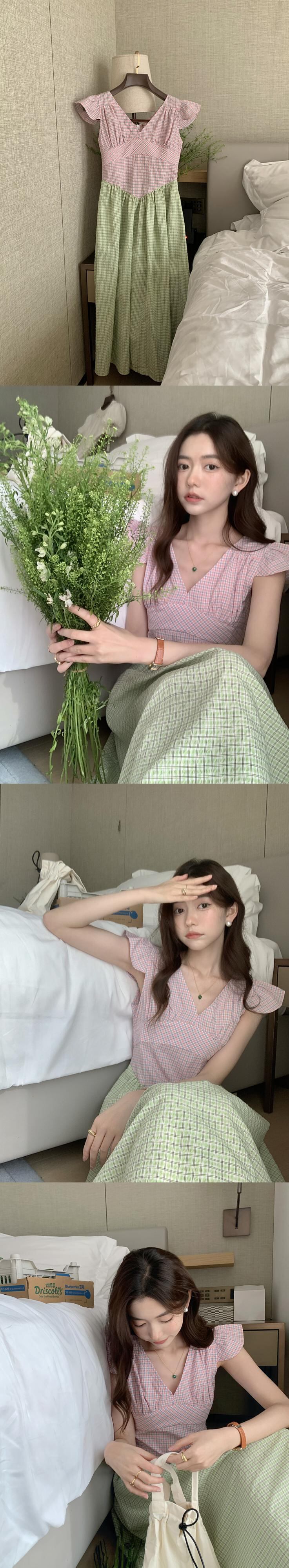 サマーVネック格子柄カラーハイウェストウェストAラインロングドレス レディース エレガント 夏物 ステッチ 5/3 春夏 SS Neploe mi4637314902606