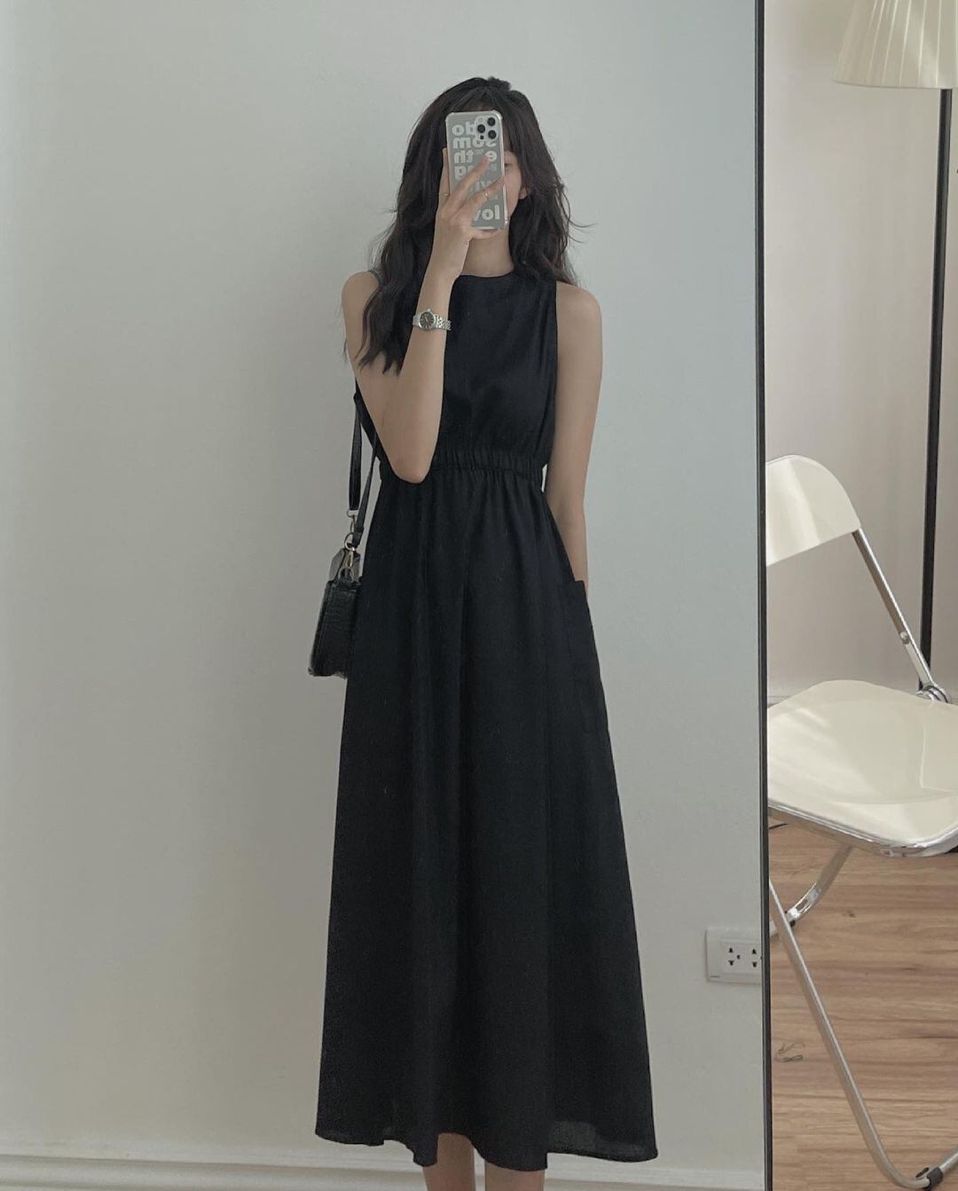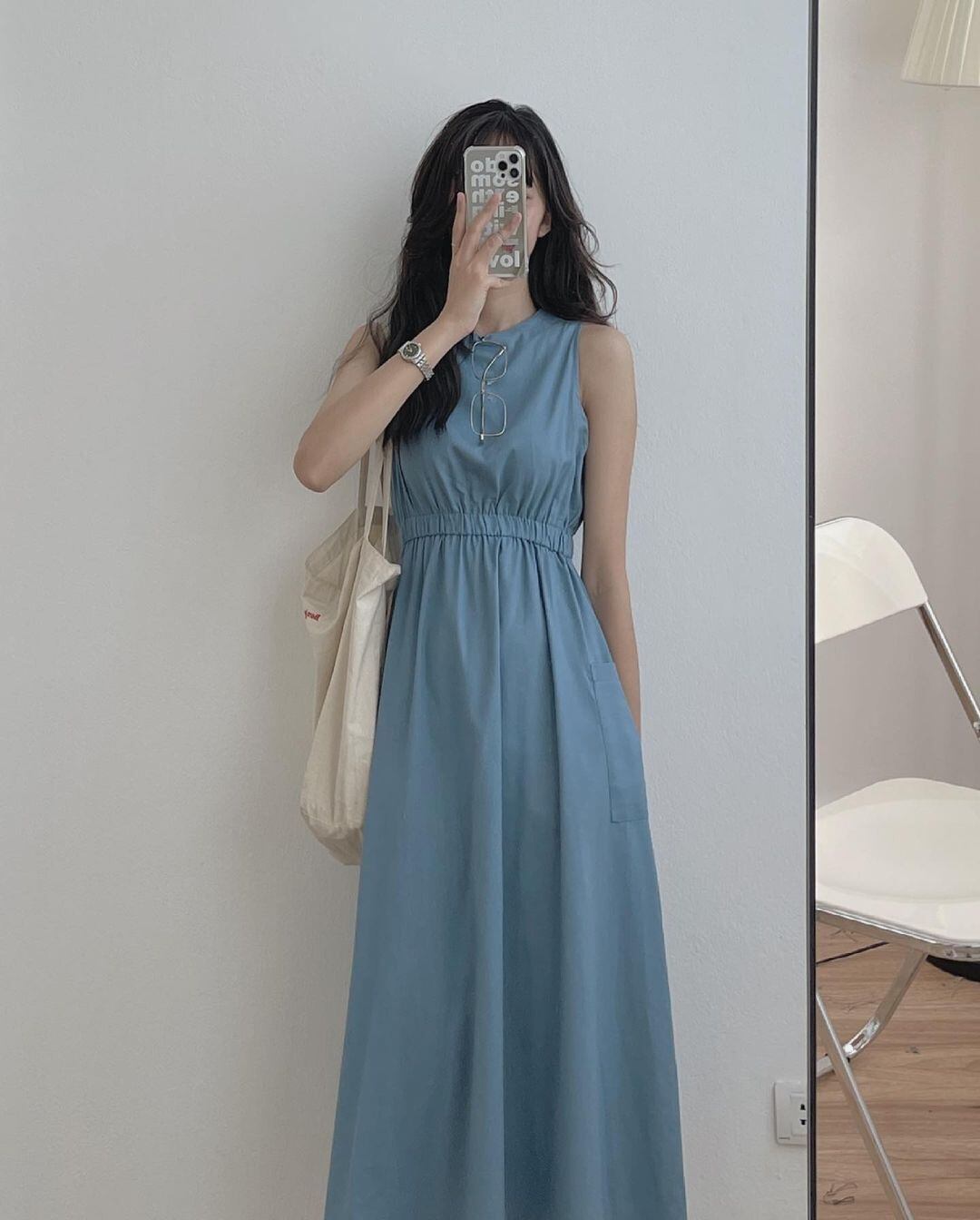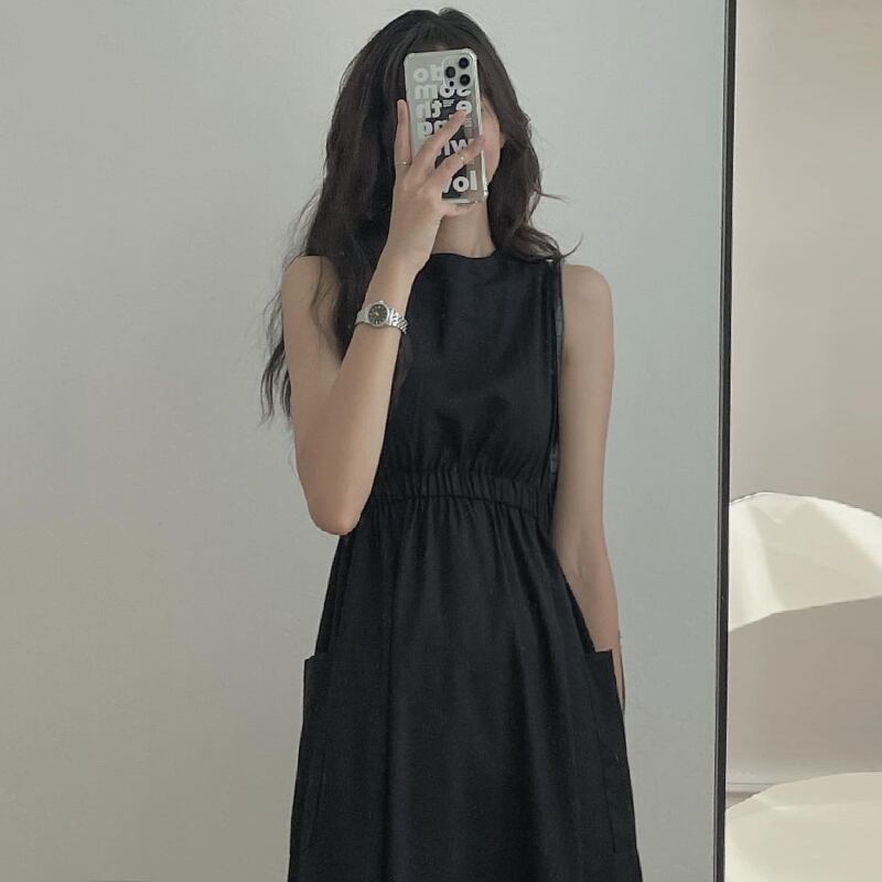 サマーラウンドネックプリーツハイウェストウェストダブルポケットノースリーブドレス 夏物 Oネック 5/3 春夏 SS Neploe mi4652130995148