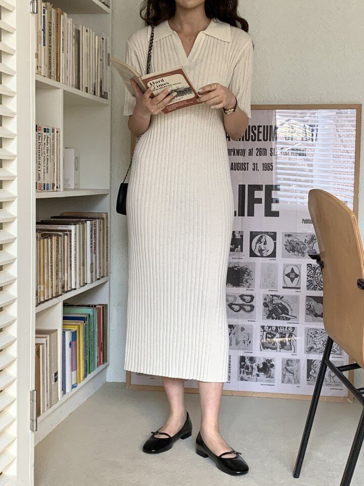 スプリングスタンダードカラーストライプスリムスリーブロングニットドレス レディース レトロ 春物 5/3 春夏 SS Neploe mi4643540241918