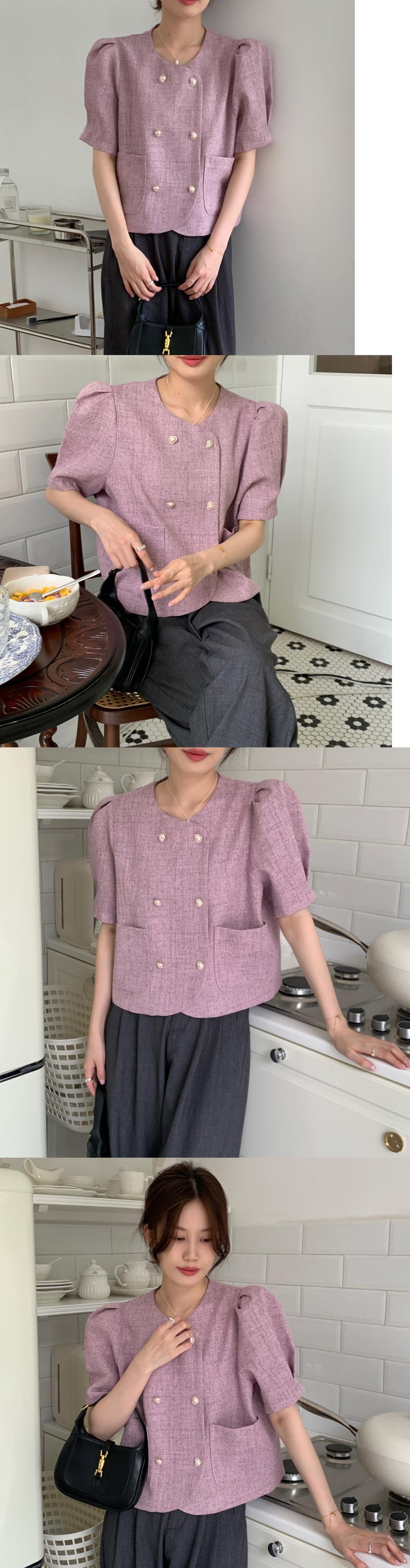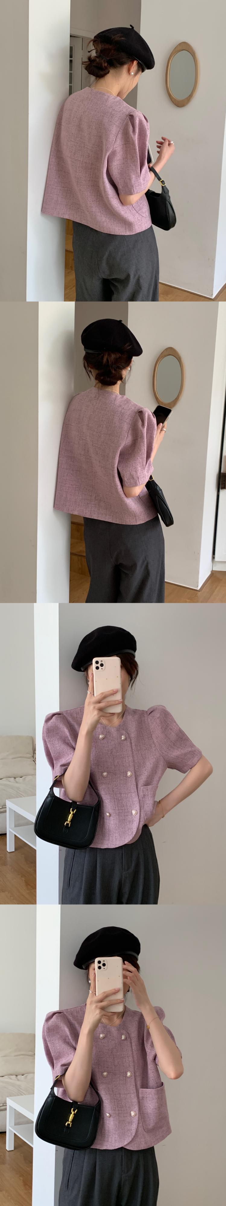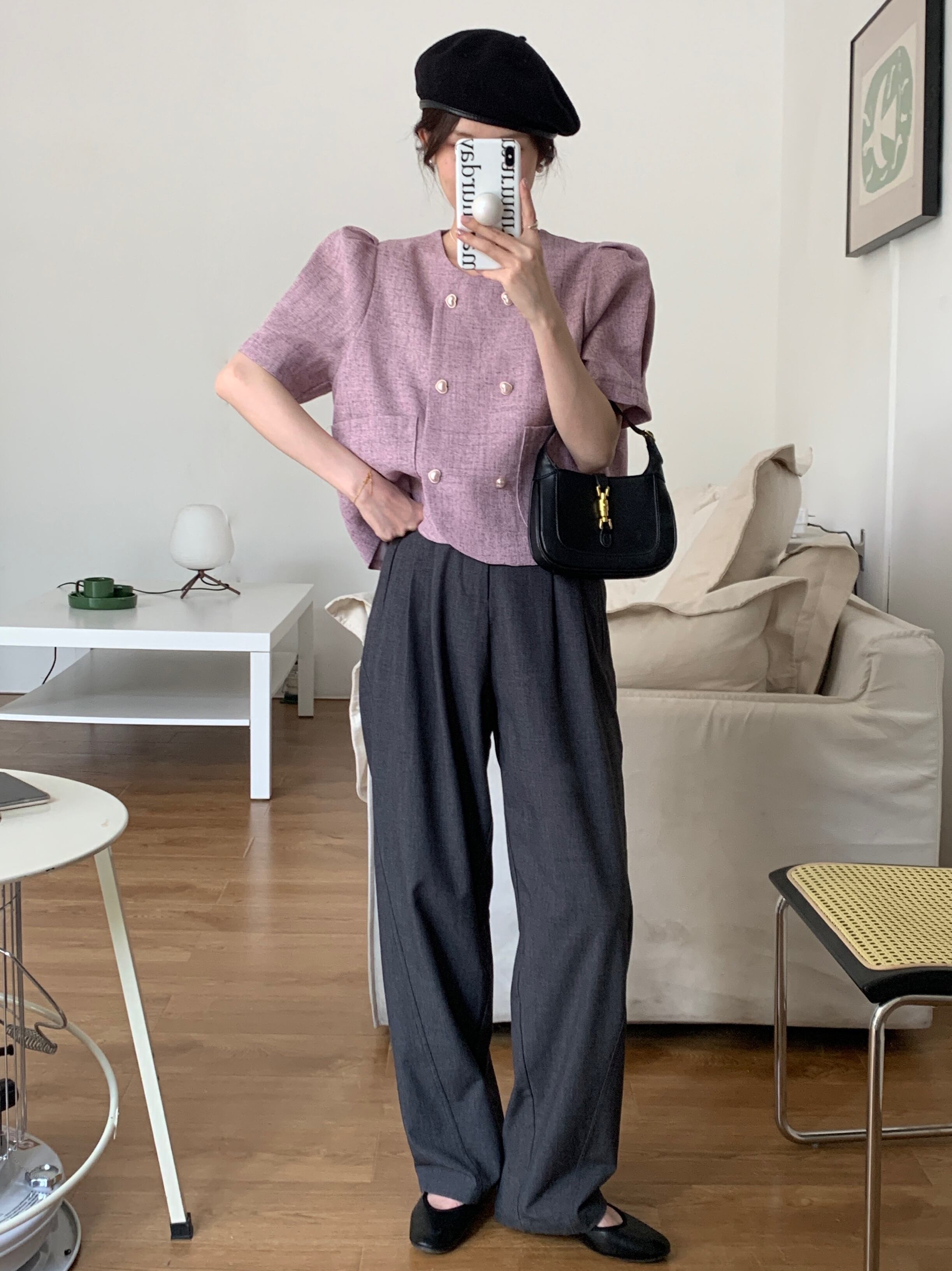 サマースタンダードラウンドネックダブルブレストルーズポケットスリーブショートジャケット レディース レトロ 夏物 Oネック 5/3 春夏 SS Neploe mi4638483816853