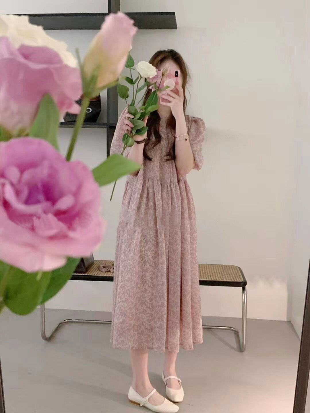 サマースタンダードラウンドネックルーズカジュアルFlowerデザイン スリーブドレス レトロ 夏物 Oネック フラワーデザイン 5/3 春夏 SS Neploe mi4697765683848