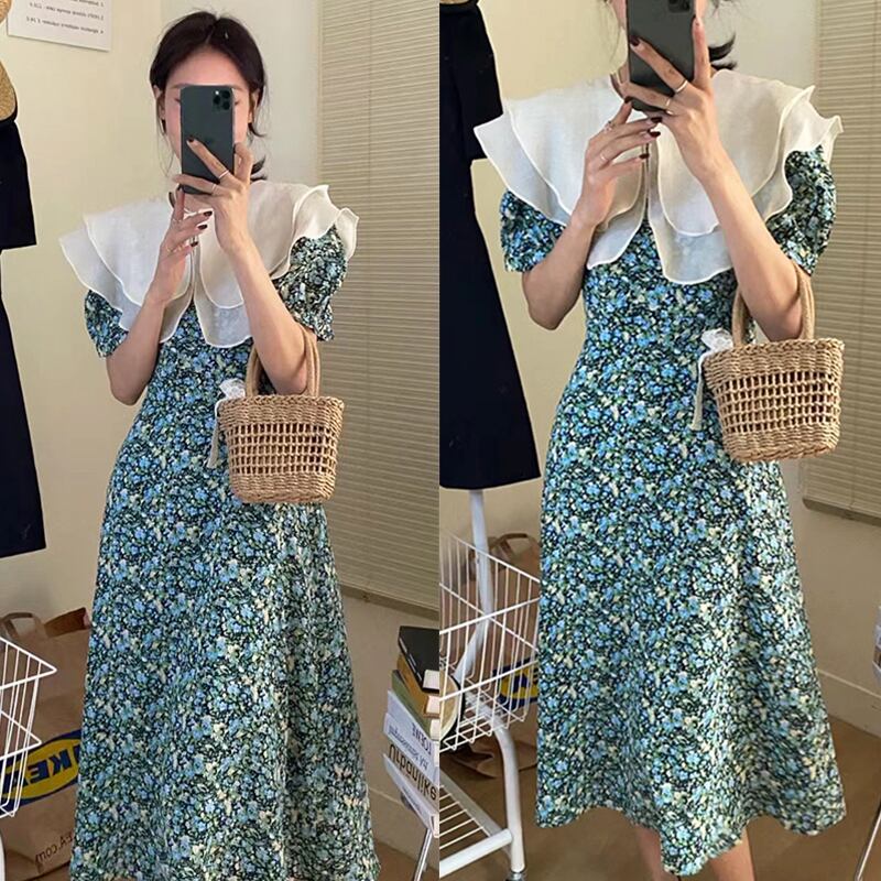 サマースタンダードカラーウェストスリーブフローラルドレス レトロ 夏物 花柄 ステッチ 5/3 春夏 SS Neploe mi461234948463