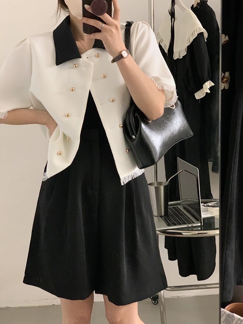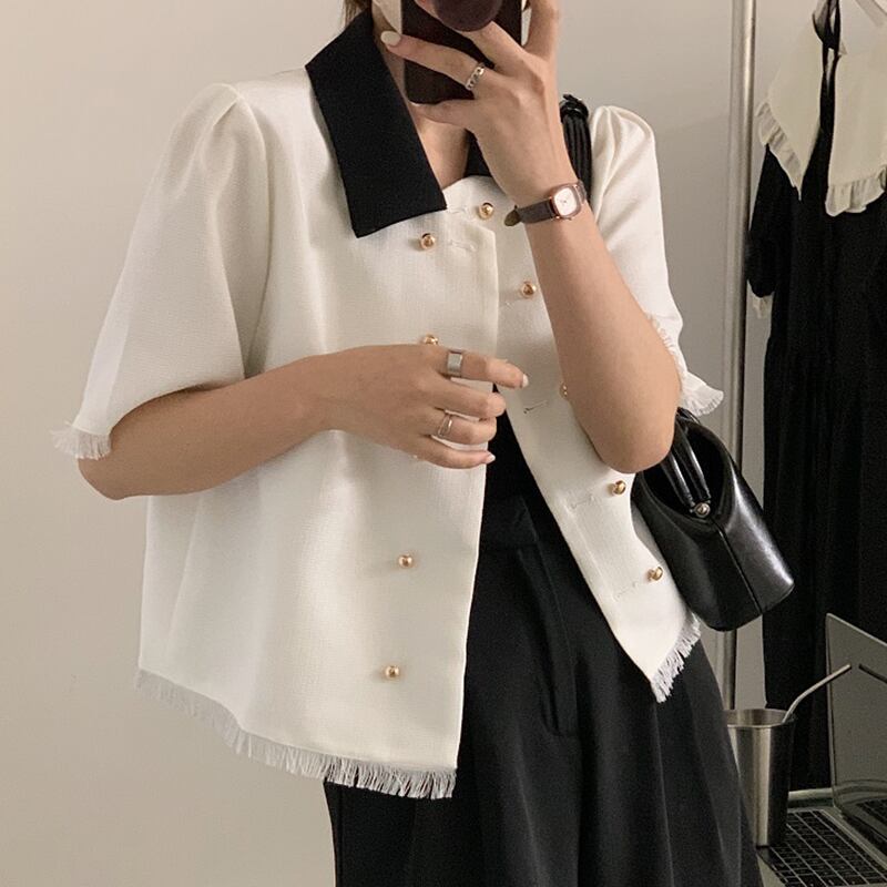 サマースタンダードカラーメタルダブルブレストスリーブジャケット レディース レトロ 夏物 5/3 春夏 SS Neploe mi4678352194656