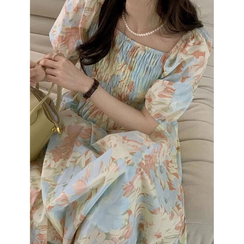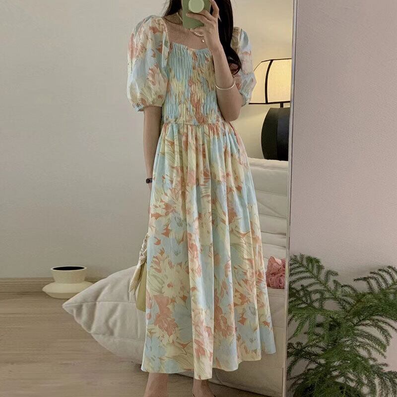 サマーフローラルプリント柄スリーブドレス ロングスカート エレガント 夏物 花柄 スクウェア 5/3 春夏 SS Neploe mi4634790320137