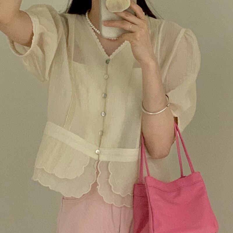 サマーVネックサイドルーズスリーブシャツ 大人ガーリー スウィート キュート カジュアル エレガント 夏物 ステッチ 5/3 春夏 SS Neploe mi4649709670456