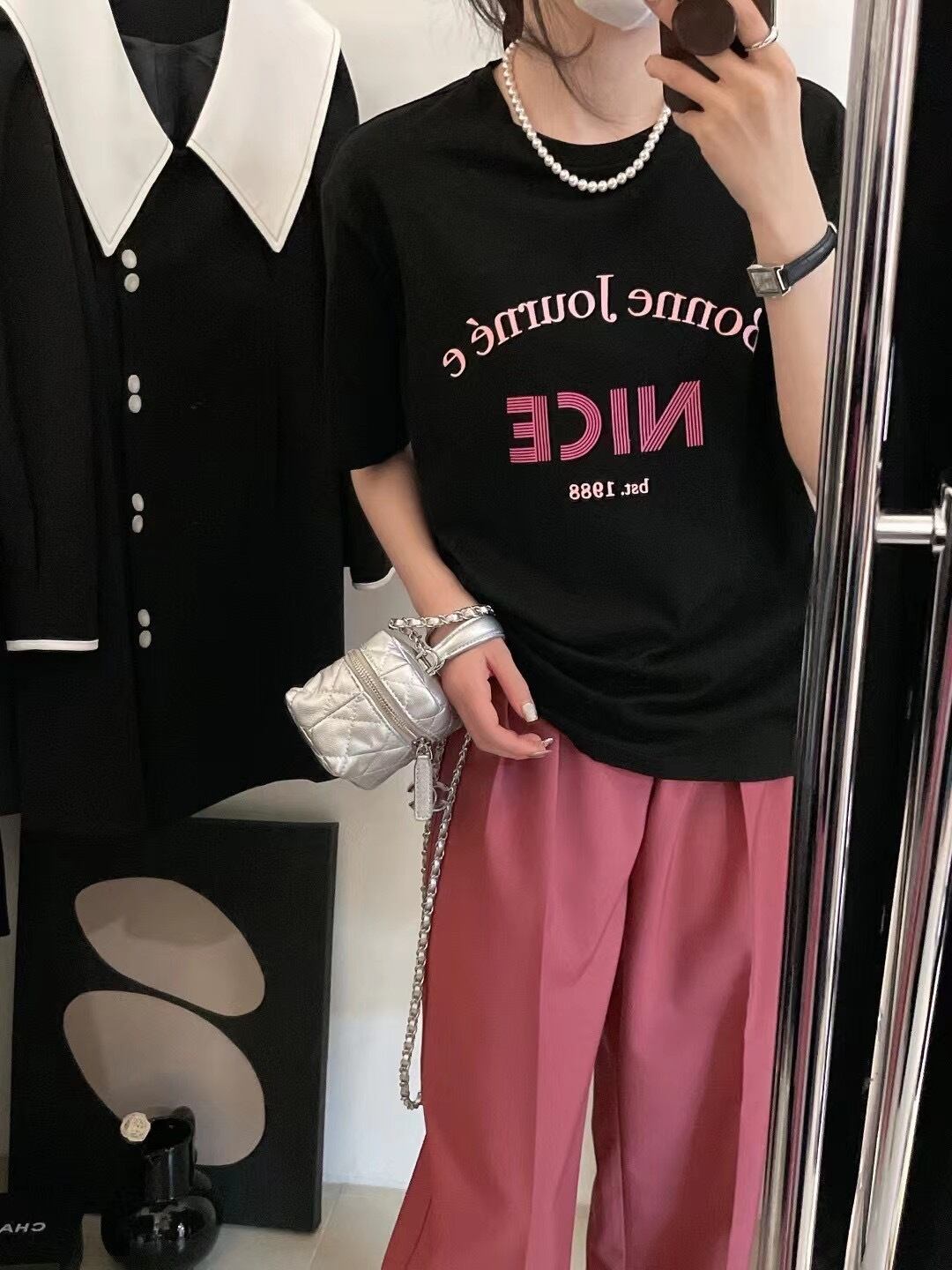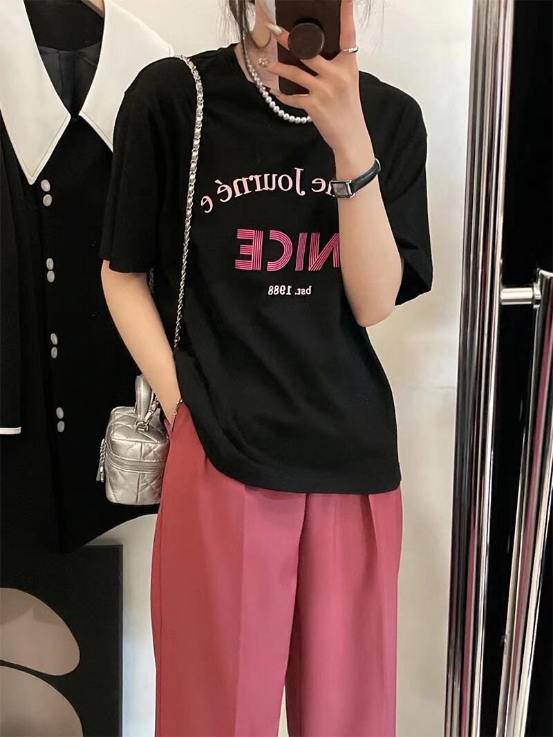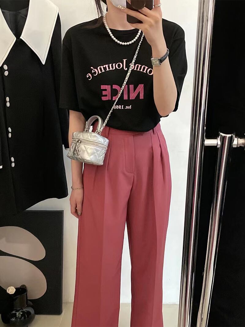スタンダードラウンドネックプリントTシャツ ハイウェストウェストカジュアルパンツ レディース レトロ Oネック 5/3 春夏 SS Neploe mi4693767545725