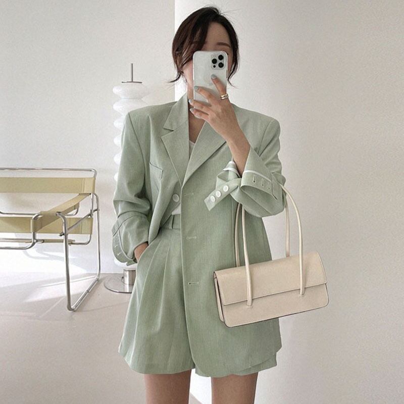 色:ライトグリーンのショートパンツ,ベージュのショートパンツ,黒のショートパンツ,薄緑のスーツ,ベージュスーツ,黒いスーツ
